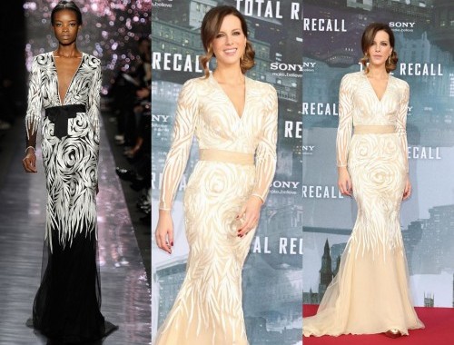 Kate Beckinsale ha invece scelto un abito lungo, avorio e rosa neutro, della collezione a/i 2012 si Naeem Khan. La scelta del colore e anche di ridurre leggermente la scollatura è risultata persino migliore rispetto alla versione dell’abito vista sulla passerella. Orecchini pendenti in oro, acconciatura sofisticata e unghie rosso a contrasto completavano la mise.
