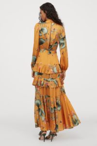 Sul sito del brand svedese l’abito viene così descritto: “Abito lungo in tessuto increspato semilucido con motivi stampati. Collo a sciarpa drappeggiato dietro e con bottoni rivestiti sulla nuca. Apertura davanti e dietro, maniche lunghe a pipistrello con elastico e bottoni rivestiti in fondo. Cucitura in vita con gonna ampia e decorata con volant. Cerniera nascosta dietro. Sottogonna corta in jersey”.