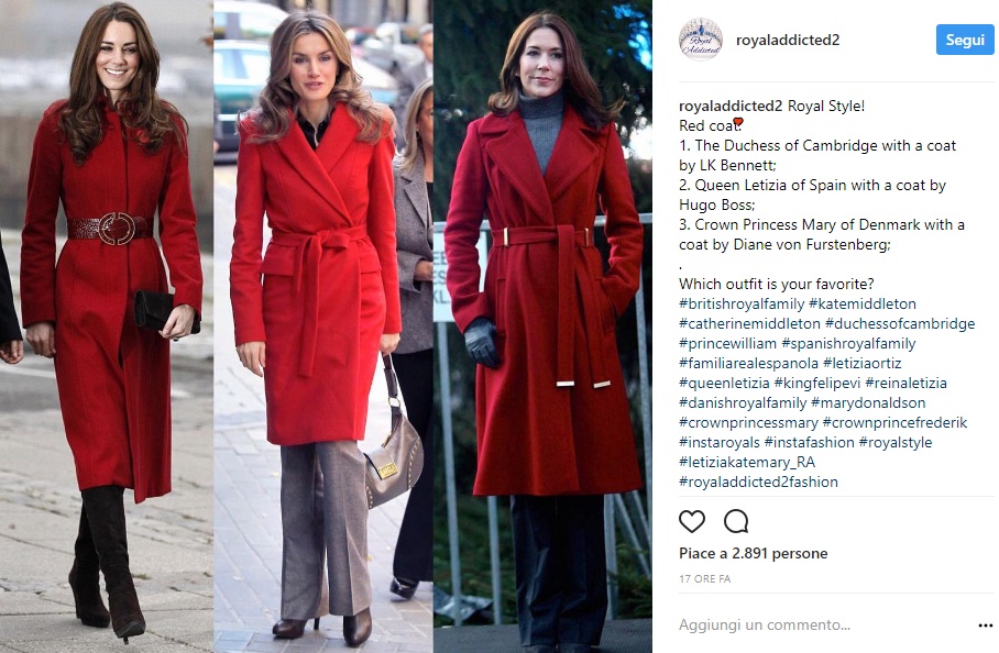 ROMA – Kate Middleton, Letizia Ortiz, Mary di Danimarca: cappotto rosso mania FOTO. Comodo, caldo, avvolgente e chic: il cappotto rosso è il vero trend di stagione. Mettete da parte i piumini perché nelle ultime stagioni il cappotto ha fatto il suo ritorno sulle passerelle delle sfilate di moda. Che sia in lana, cashmere o un misto dei due tessuti, l’importante è che sia comfy e super chic. A renderlo unico ci pensa il colore: il rosso, dopotutto, rappresenta da sempre la sensualità e l’eleganza. Non è una novità se 3 delle donne considerate più eleganti al mondo lo hanno scelto. E non stiamo parlando di tre donne qualsiasi ma di tre “teste coronate”: la Duchessa Kate Middleton, la regina di Spagna Letizia Ortiz e Mary di Danimarca. La moglie di William ha scelto un delizioso cappottino rosso firmato LK Bennett con cintura stretta in vita. Letizia Ortiz e Mary di Danimarca hanno invece optato per una versione più casual ma ugualmente molto chic: Hugo Boss per la prima, Diane Von Furstenberg per la seconda, il tratto distintivo è decisamente la cintura legata in modo sapientemente casuale.