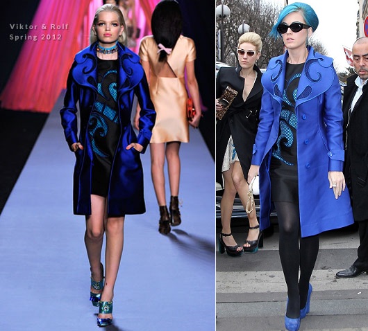 Sembra quasi aver giocato con la particolarità dei suo capelli blu, scegliendo un bellissimo completo di Viktor & Rolf p\e 2012 con la giacca blu cobalto e un tubino nero\blu.