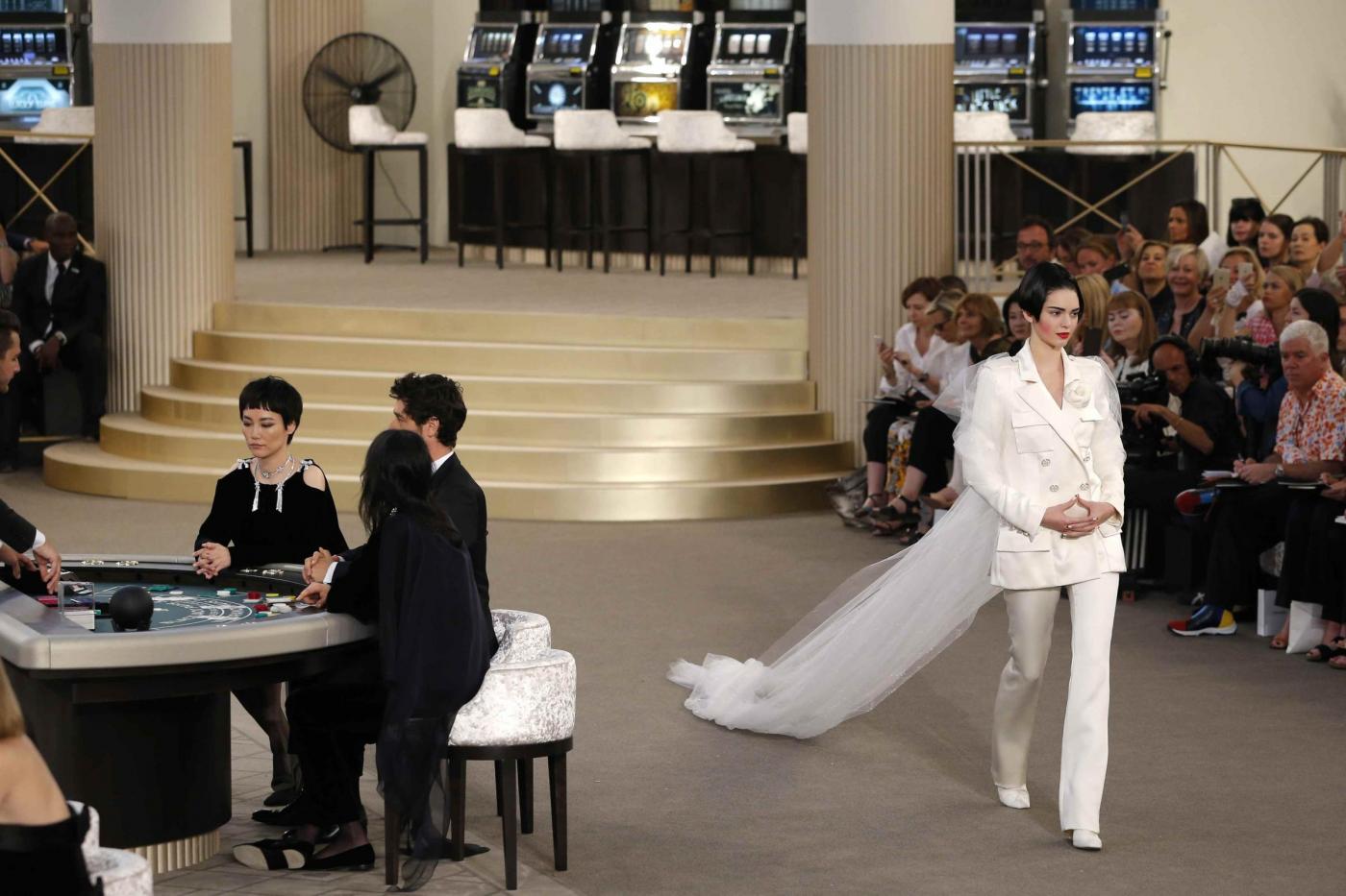 U.S. model Kendall Jenner presents a creation by German designer Karl Lagerfeld as part of his Haute Couture Fall Winter 2015/2016 fashion show for French fashion house Chanel at the Grand Palais which is transformed into a casino in Paris, France, July 7, 2015. REUTERS/Stephane Mahe