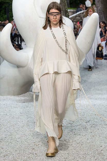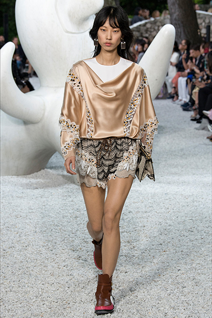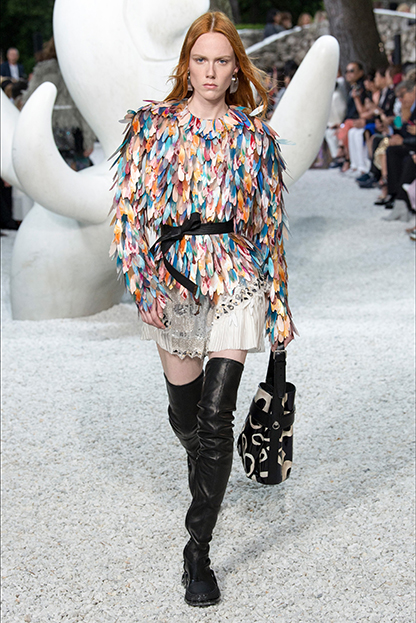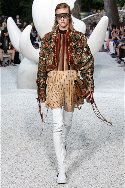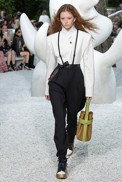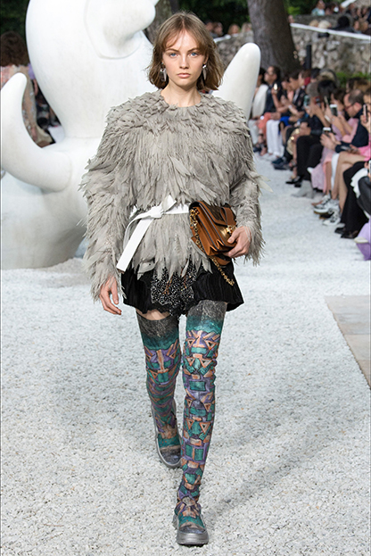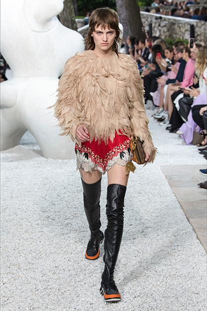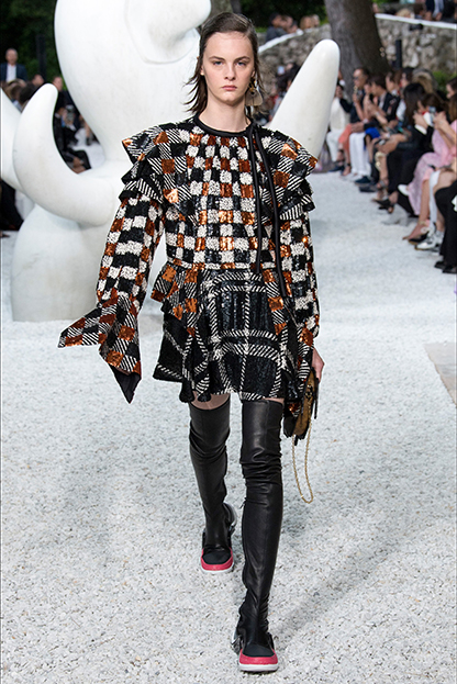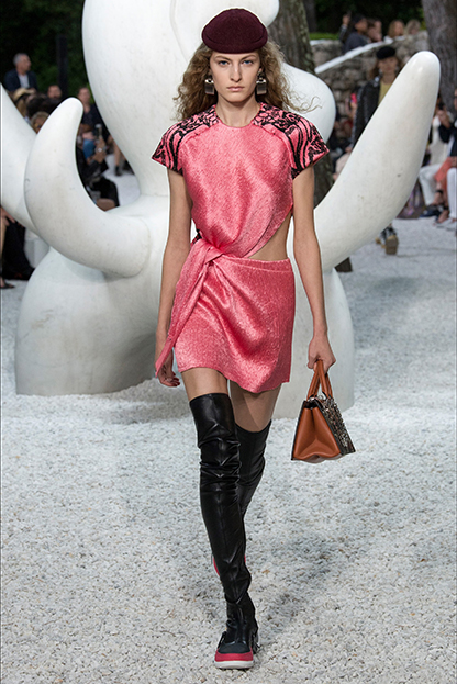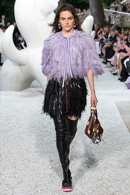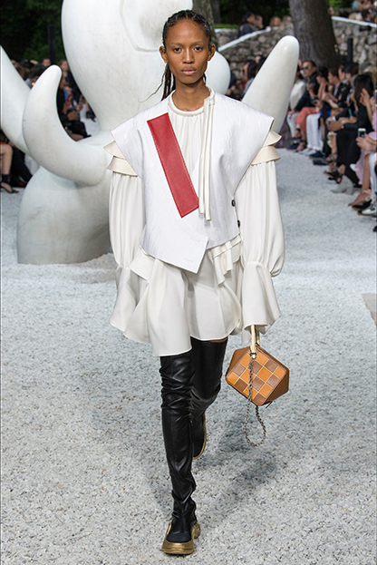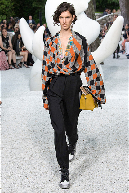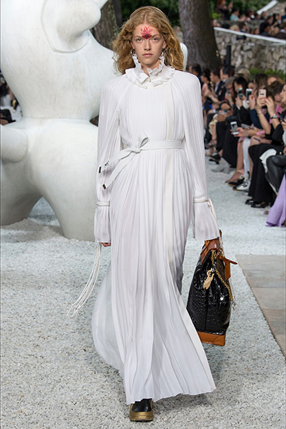 Scostumista – La Collezione Resort di Luois Vuitton alla Fondazione Maeght – La Fondazione Marguerite e Aimé Maeght si trova al sud della Francia, a Saint-Paul de Vence vicino a Nizza, capolavoro del modernismo architettonico progettato negli anni ‘50 dal catalano Josep Lluís Sert. Qui sono esposte in forma permanente opere di arte moderna e contemporanea di pittori e scultori del Novecento come Jean Mirò, Georges Braque, Raoul Ubac, Marc Chagall, Henri Matisse, Pierre Bonnard, Alberto Giacometti, Eduardo Chillida e Fernand Léger. Ed è tra queste opere che Nicolas Ghesquière ha deciso di far sfilare la collezione Resort Primavera/Estate 2019 di Louis Vuitton. Dopo le grandiose scenografie del Bob & Dolores Hope a Palm Springs, del Mac Niteroi in Brasile e del Museo Miho in Giappone la scelta del direttore creativo della storica Maison di esporre le proprie creazioni in questo meraviglioso scenario è assolutamente in linea con le precedenti. Con questa collezione Ghesquière rende omaggio all’eccentricità. Attraverso la nozione di stile personale, fa sfilare una collezione dal linguaggio completamente opposto a quello espresso nella precedente collezione autunno/ inverno 2019, che da alcuni è stata definita più borghese e poco audace. Nella corte di Giacometti le modelle attraversano il labirinto di sculture di Miró indossando alcune delle creazioni firmate Ghesquière delle ultime stagioni, amplificate e remixate per creare nuovi look inaspettati. I volumi sono pompati, lunghi abiti a pieghe si alternano a mini-dress, dettagli di lingerie si impreziosiscono di perline, denim lavati con acido sono stati dipinti a mano con motivi geometrici, vaghi richiami anni’80 sono mixati allo street-style, delicati top ricoperti di piume contrastano con le curve futuristiche delle silhouette oversize, e indistintamente, le sneakers-cuissard completano ogni look. Le borse sono frutto della collaborazione con Grace Coddington, ex direttore creativo di Vogue, basate sugli schizzi che lei fa accostando all’iconico pattern monogramma di LV, le illustrazioni dei suoi due gatti, Pumpkin e Blanket, e di Léon, il cane di Nicolas Ghesquière. Tra gli ospiti: Emma Stone, Sienna Miller, Jennifer Connelly, Léa Seydoux, Justin Theroux, Ruth Negga e Isabelle Huppert. L’artista francese Woodkid, con una performance musicale dal vivo ha riunito gli strumenti inventati dai fratelli Baschet negli anni ’50, quando condussero i loro esperimenti acustici creando sonorità attraverso le vibrazioni del vetro e del metallo. Ghesquière riesce così a far dialogare moda, architettura, musica e natura attraverso un linguaggio sperimentale e una visione d’avanguardia, percorso che lo stilista sta affrontando da cinque anni, per portare un brand storico e classico verso codici più innovativi. La scorsa settimana Nicolas Ghesquière su Instagram ha annunciato di aver rinnovato il contratto con Louis Vuitton con l’hashtag #notgoinganywhere. Michael Burke, presidente e amministratore delegato di LV, ha dichiarato che il designer rimarrà alla direzione creativa del marchio per almeno altri cinque anni. “Personalmente penso che se vuoi sviluppare un vero punto di vista audace, un punto di vista diverso, devi concederti del tempo”, ha aggiunto Burke. Lo straordinario lavoro del designer francese avrà così modo di continuare ad evolversi e arricchire un brand così pieno di storia aggiungendovi una visione moderna e contemporanea sempre pronta ad interagire con pezzi d’arte come quelli che hanno fatto da sfondo a questa sfilata. di Annapaola Brancia d’Apricena