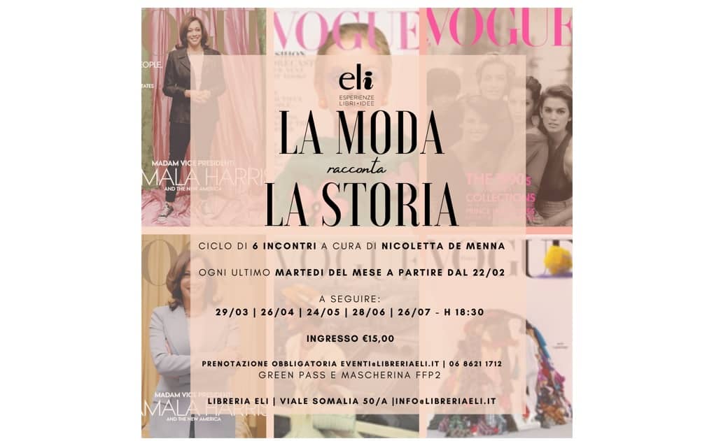 Presso la Libreria ELI, da martedì 22 febbraio, Nicoletta De Menna proporrà un ciclo di incontri mensili prendendo spunto da alcune iconiche copertine di Vogue, per far rivivere la Storia della Moda dell’ultimo secolo, con una chiave di lettura del tutto particolare. Il primo incontro di martedì 22 gennaio delle ore 18.30 dal titolo “L’abito fa ancora il monaco?”, sarà dedicato ai messaggi e alle chiavi di lettura per la rappresentazione estetica delle donne al potere mettendo a confronto due copertine di Vogue America 2021 dedicate alla vicepresidente Kamala Harris. (Prenotazione obbligatoria: eventi@libreriaeli.it).