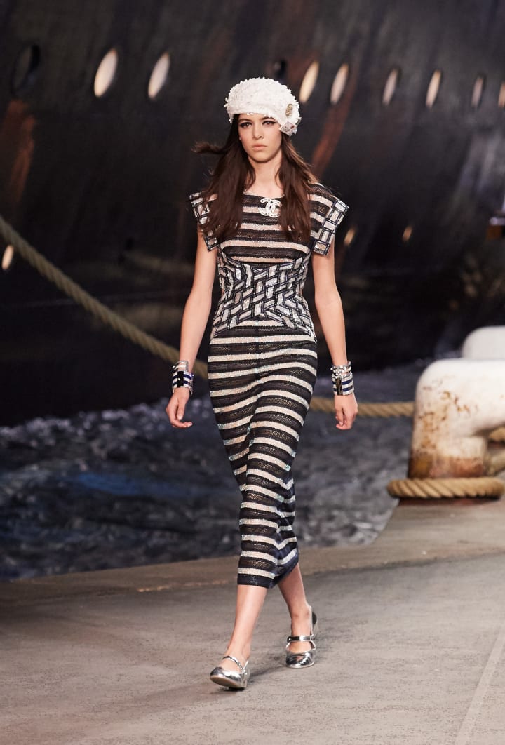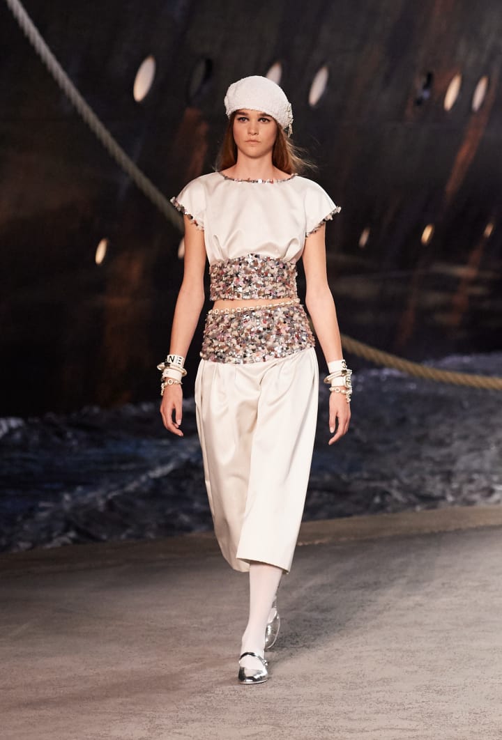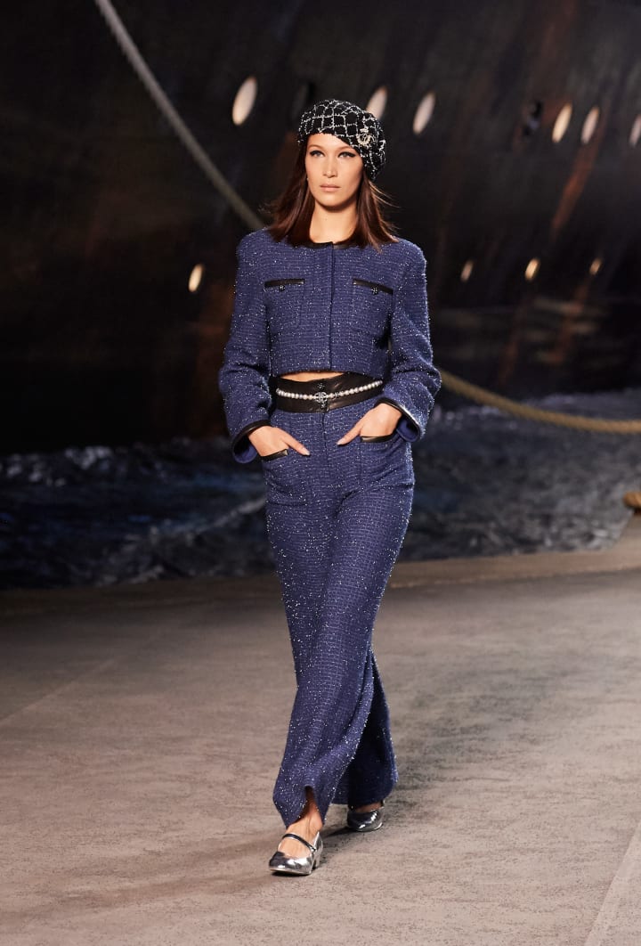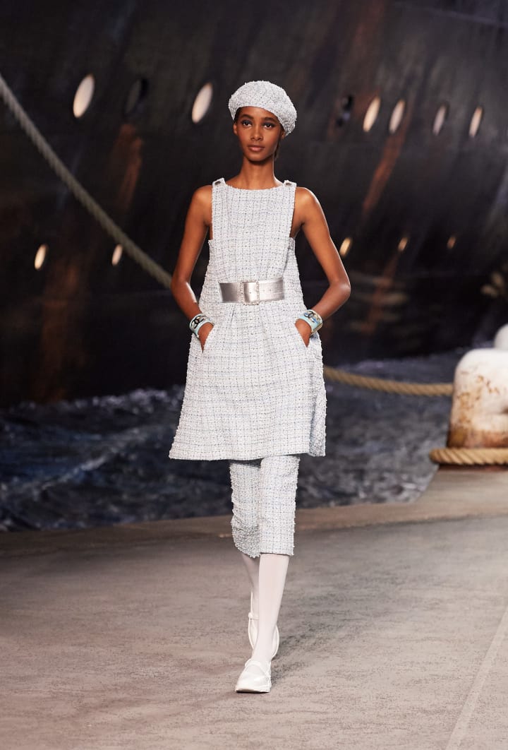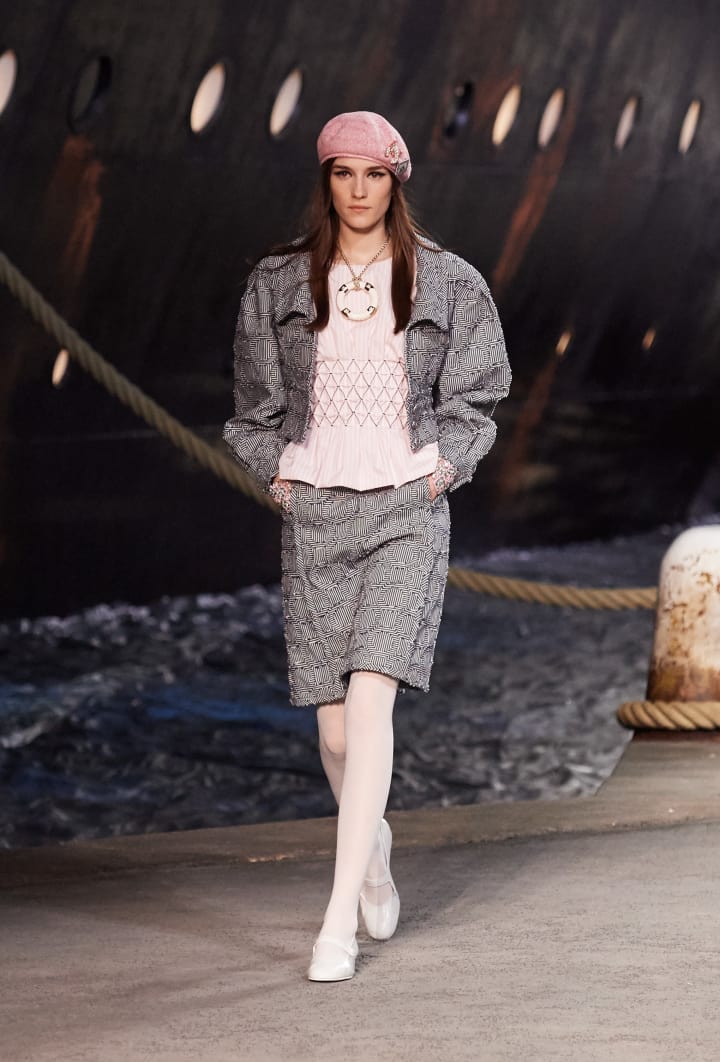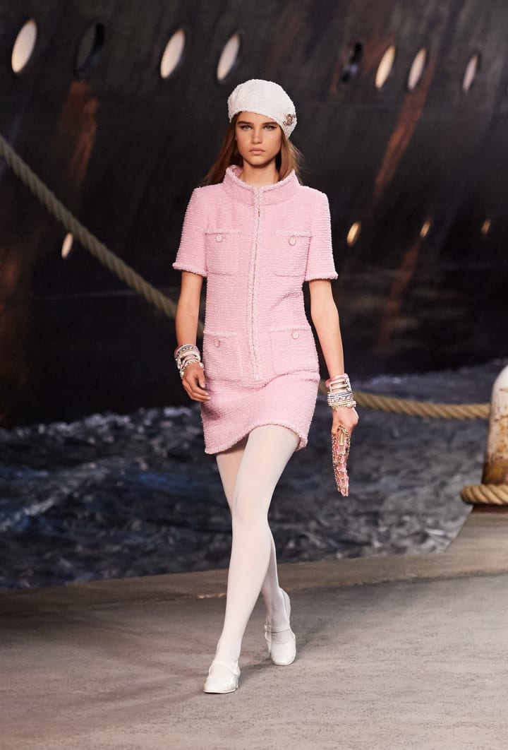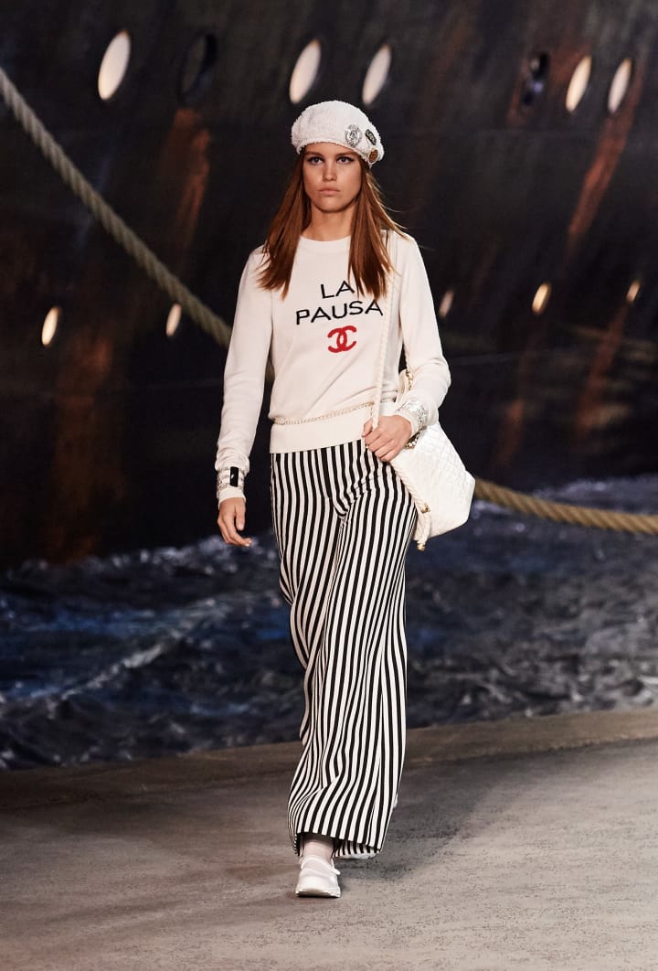 Scostumista– La Pausa-Chanel Cruise 2018/19 – Il capitano Karl Lagerfeld ha presentato la Cruise Collection 2018/19 mentre cadeva la notte su “La Pausa”, il transatlantico Chanel ormeggiato al Grand Palais di Parigi. Riprendendo il nome della villa costruita da Gabrielle Chanel, arroccata a Roquebrune-Cap-Martin in Riviera, “La Pausa” era l’amata residenza estiva di Coco. L’amore di Gabrielle per lo yachting e il mare le offrivano l’opportunità di concedersi una pausa dalla sua vita frenetica di Parigi, ricaricare le batterie e cercare nuova ispirazione. Dopo aver scelto destinazioni come Cuba e Dallas per mostrare le sue collezioni resort, questa stagione Chanel è tornata a Parigi con l’obiettivo di celebrare il concetto di moda da crociera in senso letterale. Con il fischiettio di “The Whistle song” si apre la sfilata che comprende più di ottanta outfit. Il Mar Mediterraneo ispira le silhouette, e il nome della nave è stampato sui bottoni di giacche di tweed, bracciali e maglioni. I maglioni a costine color crema hanno bottoni dorati con l’ancora, e ampi pantaloni bianchi sono indossati con Mary Janes rigorosamente flat, come da etichetta per poter salire a bordo. Il bianco, il colore principale della collezione Cruise, ricorda la schiuma sulle onde e le scie lasciate dalle barche mentre si muovono attraverso l’acqua, così come l’uniforme dell’equipaggio di una nave. Il concetto vintage di abbigliamento da crociera o da resort ha preso il centro della scena con pantaloni a righe, top bretoni e giacche monopetto con scollature a barca. Giacche di tweed, gonne corte e pieghettate, così come abiti, sono indossati in una palette pastello di tonalità rosa per una silhouette femminile. Le modelle indossano un basco in tweed modellato senza cuciture, ricamato con paillettes, total -white, incrociato con il blu o in versione tricolore bianco, corallo e albicocca. Gli occhiali sono oblò dalla lente blu specchiata. Gli abiti da sera sono decorati con perline, mentre il classico tweed della casa si presenta con una gonna a pieghe e una giacca corta. Righe orizzontali blu e bianche ricorrono su abiti impreziositi da piume. L’uniforme da marinaio, appare in vari motivi in tutta la collezione su top, bracciali con polsini e guanti senza dita, e affiorano su popeline di cotone, chiffon di seta e rete da pesca. La Boy di Chanel assume una nuova forma per la collezione Cruise 2018/19. La borsa cross-body in pelle trapuntata ha i colori nautici della collezione. Cavalcando l’onda della moda per gli slogan, la Maison ha presentato t-shirt e felpe stampate con il motivo La Pausa. Tra i compagni di navigazione c’erano Gigi e Bella Hadid e Kaia Gerber che ha chiuso lo spettacolo. Tra gli ospiti in banchina: la brand ambassador Kristen Stewart, Lily-Rose Depp e Margot Robbie. Gli invitati allo spettacolo Cruise 2018/19 sono poi saliti a bordo del transatlantico “La Pausa” per l’after party, e per assistere ad un’esibizione speciale della cantante Corine. “Quando la collezione crociere arriverà in negozio a novembre, la donna Chanel sarà molto felice di vederla lì”, ha detto il presidente di Chanel, Bruno Pavlovsky prima dello spettacolo, “c’è qualcosa di speranzoso al riguardo, qualcosa che suggerisce che possiamo fuggire, qualcosa che dice che possiamo navigare lontano da tutto “. di Annapaola Brancia d’Apricena