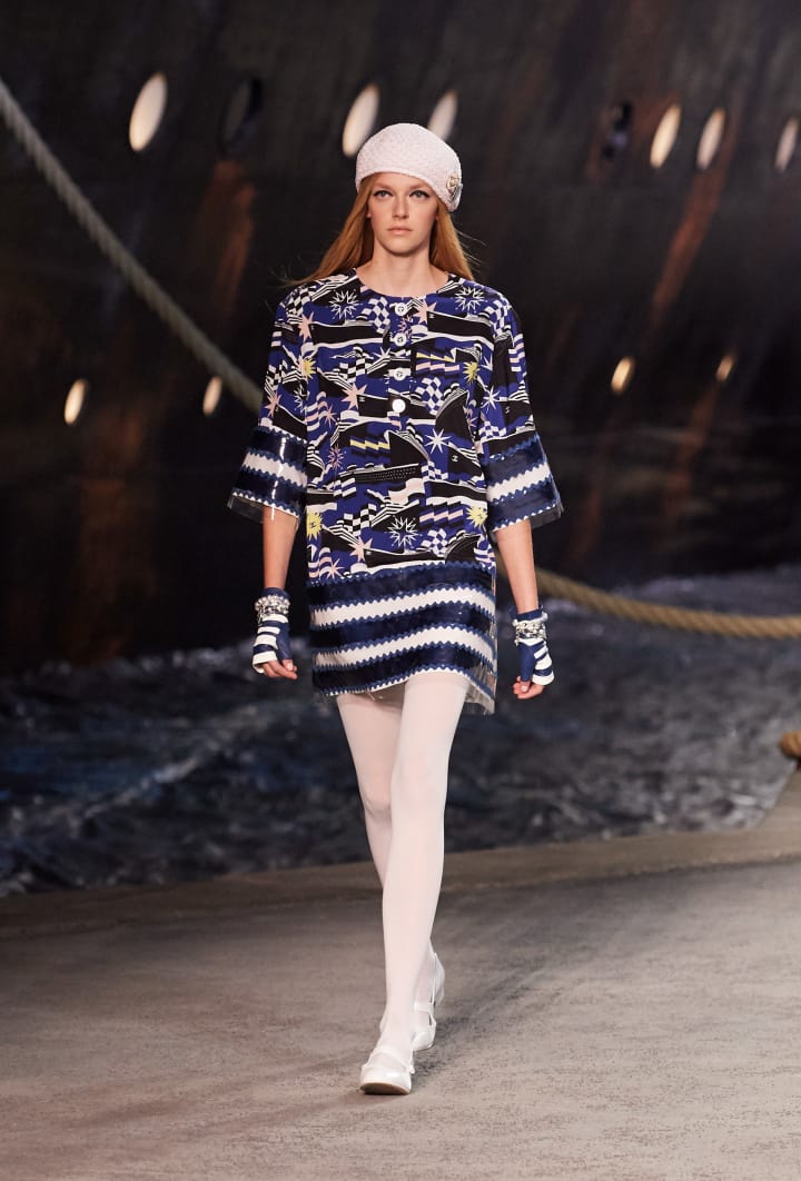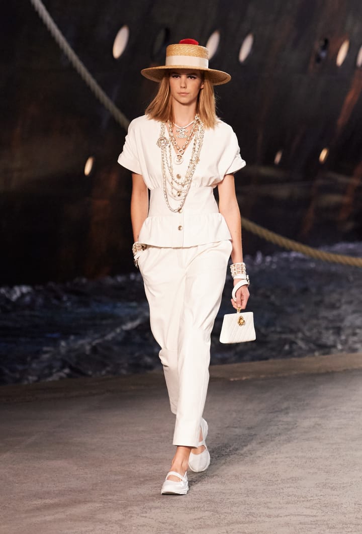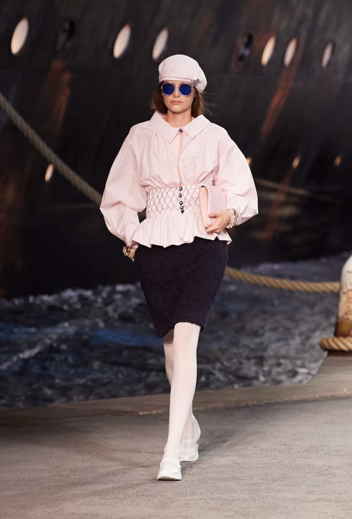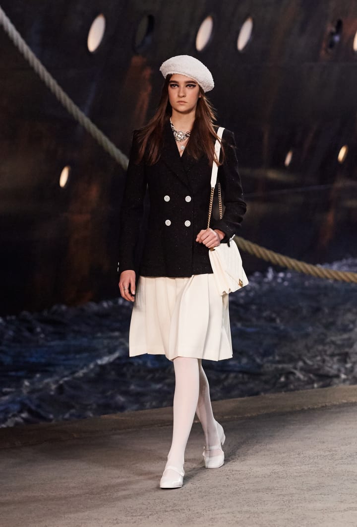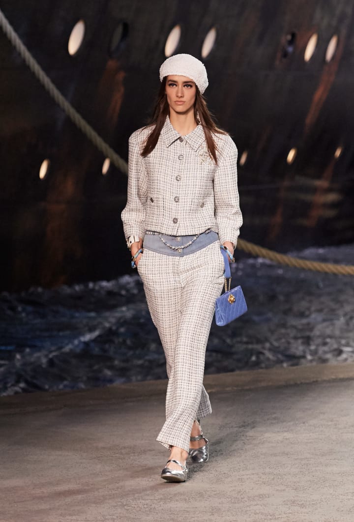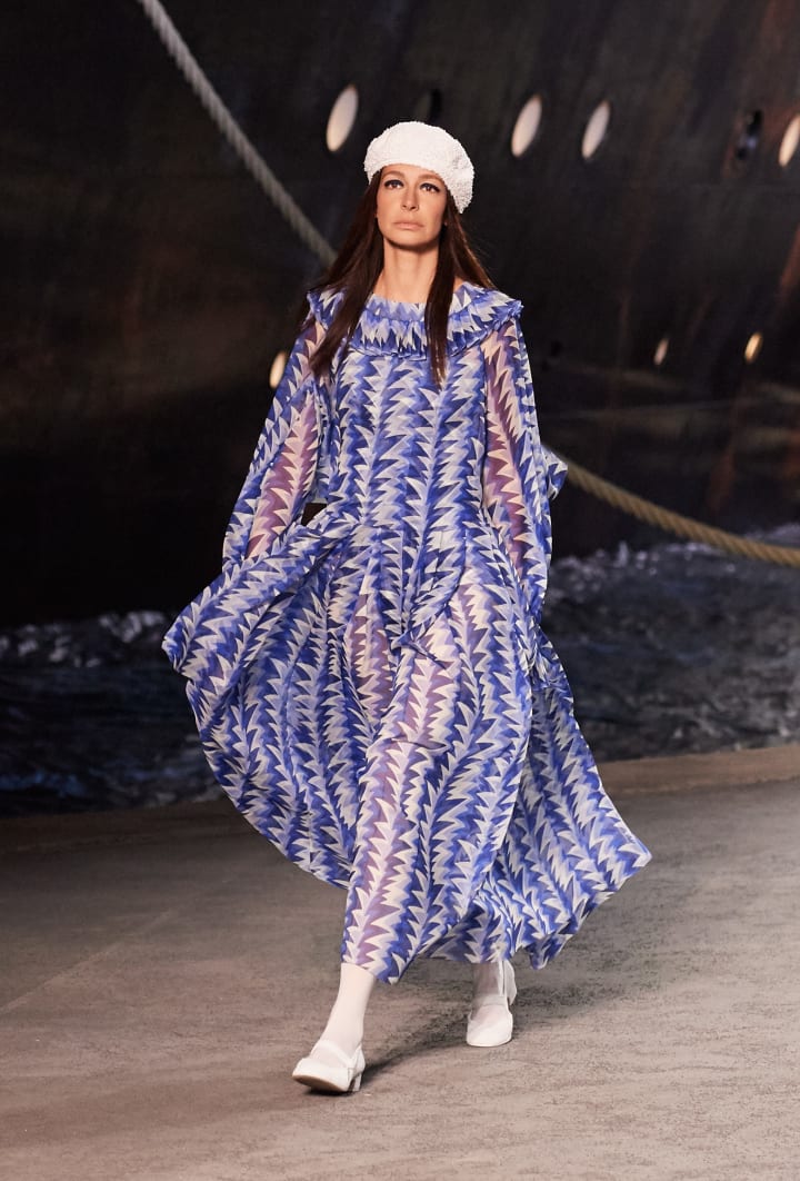 Scostumista– La Pausa-Chanel Cruise 2018/19 – Il capitano Karl Lagerfeld ha presentato la Cruise Collection 2018/19 mentre cadeva la notte su “La Pausa”, il transatlantico Chanel ormeggiato al Grand Palais di Parigi. Riprendendo il nome della villa costruita da Gabrielle Chanel, arroccata a Roquebrune-Cap-Martin in Riviera, “La Pausa” era l’amata residenza estiva di Coco. L’amore di Gabrielle per lo yachting e il mare le offrivano l’opportunità di concedersi una pausa dalla sua vita frenetica di Parigi, ricaricare le batterie e cercare nuova ispirazione. Dopo aver scelto destinazioni come Cuba e Dallas per mostrare le sue collezioni resort, questa stagione Chanel è tornata a Parigi con l’obiettivo di celebrare il concetto di moda da crociera in senso letterale. Con il fischiettio di “The Whistle song” si apre la sfilata che comprende più di ottanta outfit. Il Mar Mediterraneo ispira le silhouette, e il nome della nave è stampato sui bottoni di giacche di tweed, bracciali e maglioni. I maglioni a costine color crema hanno bottoni dorati con l’ancora, e ampi pantaloni bianchi sono indossati con Mary Janes rigorosamente flat, come da etichetta per poter salire a bordo. Il bianco, il colore principale della collezione Cruise, ricorda la schiuma sulle onde e le scie lasciate dalle barche mentre si muovono attraverso l’acqua, così come l’uniforme dell’equipaggio di una nave. Il concetto vintage di abbigliamento da crociera o da resort ha preso il centro della scena con pantaloni a righe, top bretoni e giacche monopetto con scollature a barca. Giacche di tweed, gonne corte e pieghettate, così come abiti, sono indossati in una palette pastello di tonalità rosa per una silhouette femminile. Le modelle indossano un basco in tweed modellato senza cuciture, ricamato con paillettes, total -white, incrociato con il blu o in versione tricolore bianco, corallo e albicocca. Gli occhiali sono oblò dalla lente blu specchiata. Gli abiti da sera sono decorati con perline, mentre il classico tweed della casa si presenta con una gonna a pieghe e una giacca corta. Righe orizzontali blu e bianche ricorrono su abiti impreziositi da piume. L’uniforme da marinaio, appare in vari motivi in tutta la collezione su top, bracciali con polsini e guanti senza dita, e affiorano su popeline di cotone, chiffon di seta e rete da pesca. La Boy di Chanel assume una nuova forma per la collezione Cruise 2018/19. La borsa cross-body in pelle trapuntata ha i colori nautici della collezione. Cavalcando l’onda della moda per gli slogan, la Maison ha presentato t-shirt e felpe stampate con il motivo La Pausa. Tra i compagni di navigazione c’erano Gigi e Bella Hadid e Kaia Gerber che ha chiuso lo spettacolo. Tra gli ospiti in banchina: la brand ambassador Kristen Stewart, Lily-Rose Depp e Margot Robbie. Gli invitati allo spettacolo Cruise 2018/19 sono poi saliti a bordo del transatlantico “La Pausa” per l’after party, e per assistere ad un’esibizione speciale della cantante Corine. “Quando la collezione crociere arriverà in negozio a novembre, la donna Chanel sarà molto felice di vederla lì”, ha detto il presidente di Chanel, Bruno Pavlovsky prima dello spettacolo, “c’è qualcosa di speranzoso al riguardo, qualcosa che suggerisce che possiamo fuggire, qualcosa che dice che possiamo navigare lontano da tutto “. di Annapaola Brancia d’Apricena