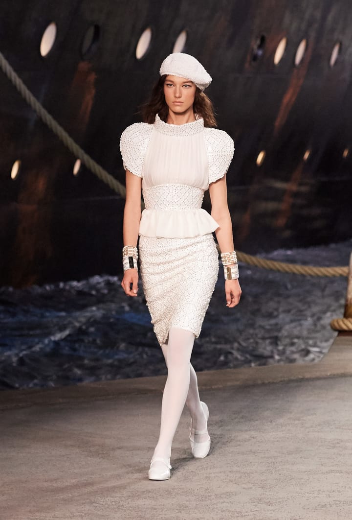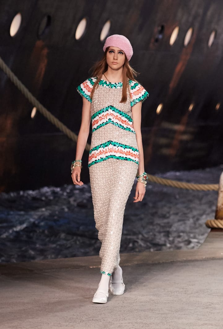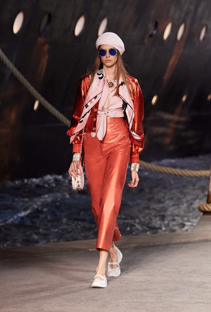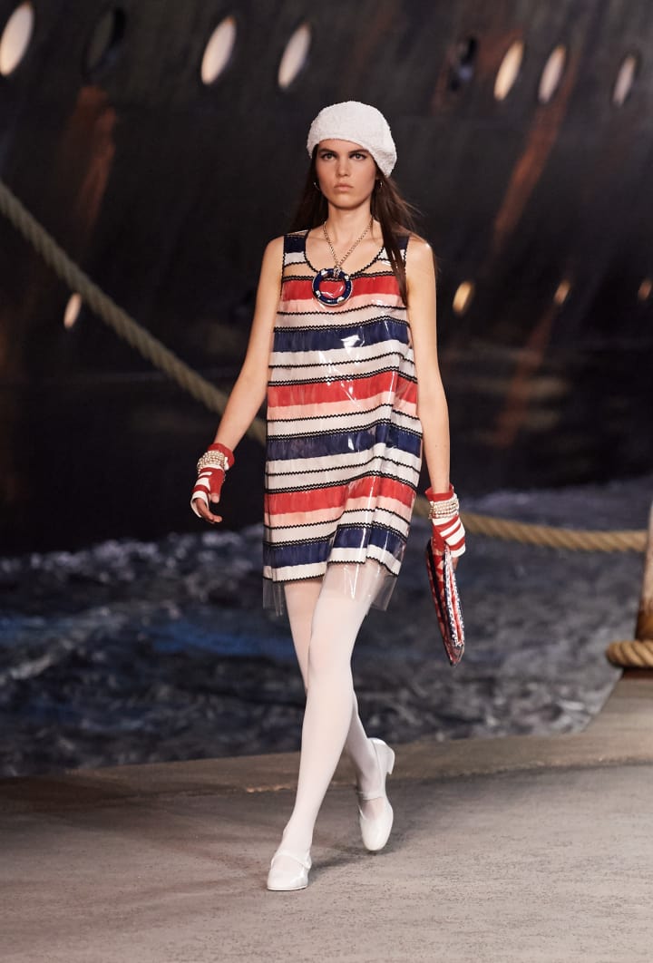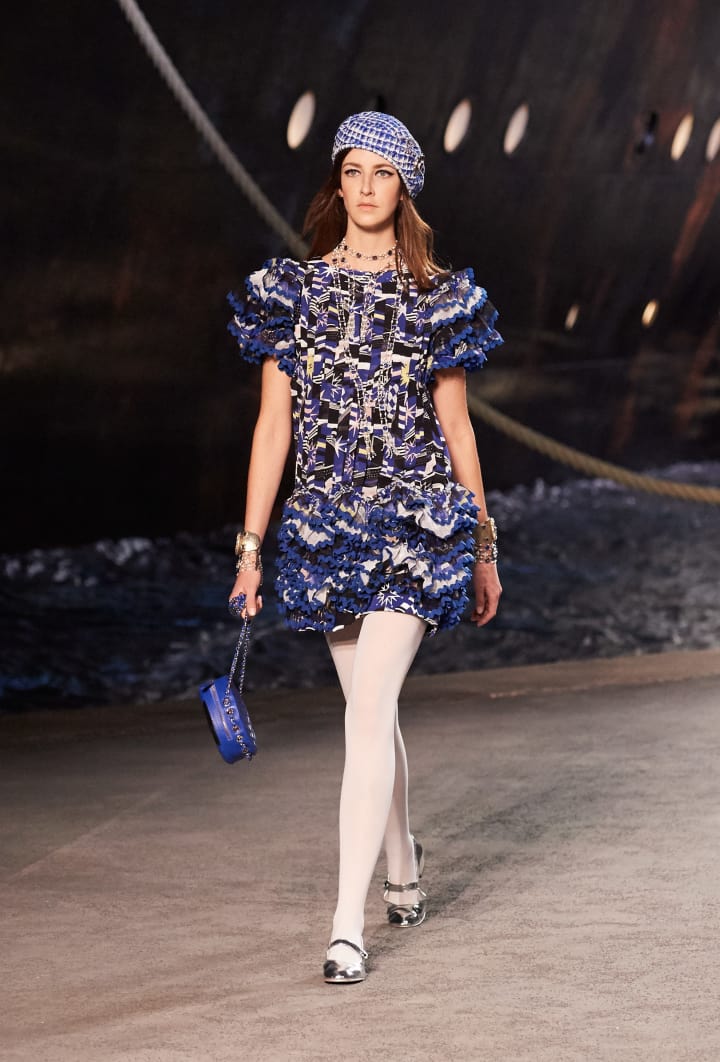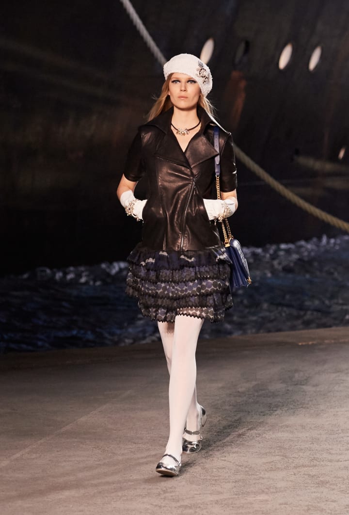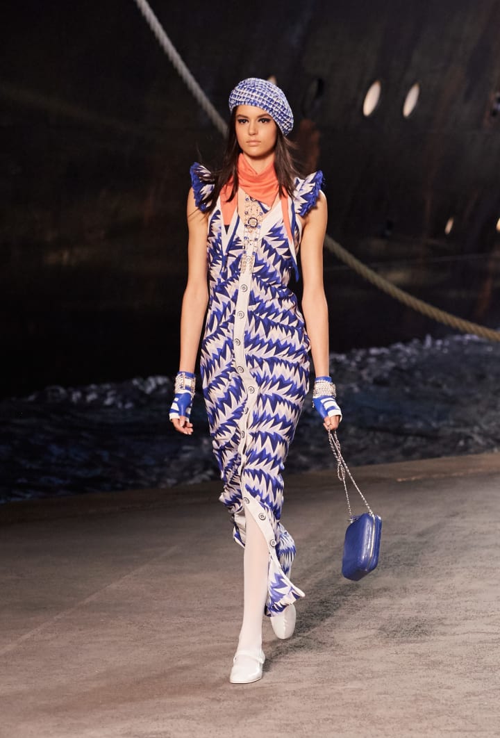 Scostumista– La Pausa-Chanel Cruise 2018/19 – Il capitano Karl Lagerfeld ha presentato la Cruise Collection 2018/19 mentre cadeva la notte su “La Pausa”, il transatlantico Chanel ormeggiato al Grand Palais di Parigi. Riprendendo il nome della villa costruita da Gabrielle Chanel, arroccata a Roquebrune-Cap-Martin in Riviera, “La Pausa” era l’amata residenza estiva di Coco. L’amore di Gabrielle per lo yachting e il mare le offrivano l’opportunità di concedersi una pausa dalla sua vita frenetica di Parigi, ricaricare le batterie e cercare nuova ispirazione. Dopo aver scelto destinazioni come Cuba e Dallas per mostrare le sue collezioni resort, questa stagione Chanel è tornata a Parigi con l’obiettivo di celebrare il concetto di moda da crociera in senso letterale. Con il fischiettio di “The Whistle song” si apre la sfilata che comprende più di ottanta outfit. Il Mar Mediterraneo ispira le silhouette, e il nome della nave è stampato sui bottoni di giacche di tweed, bracciali e maglioni. I maglioni a costine color crema hanno bottoni dorati con l’ancora, e ampi pantaloni bianchi sono indossati con Mary Janes rigorosamente flat, come da etichetta per poter salire a bordo. Il bianco, il colore principale della collezione Cruise, ricorda la schiuma sulle onde e le scie lasciate dalle barche mentre si muovono attraverso l’acqua, così come l’uniforme dell’equipaggio di una nave. Il concetto vintage di abbigliamento da crociera o da resort ha preso il centro della scena con pantaloni a righe, top bretoni e giacche monopetto con scollature a barca. Giacche di tweed, gonne corte e pieghettate, così come abiti, sono indossati in una palette pastello di tonalità rosa per una silhouette femminile. Le modelle indossano un basco in tweed modellato senza cuciture, ricamato con paillettes, total -white, incrociato con il blu o in versione tricolore bianco, corallo e albicocca. Gli occhiali sono oblò dalla lente blu specchiata. Gli abiti da sera sono decorati con perline, mentre il classico tweed della casa si presenta con una gonna a pieghe e una giacca corta. Righe orizzontali blu e bianche ricorrono su abiti impreziositi da piume. L’uniforme da marinaio, appare in vari motivi in tutta la collezione su top, bracciali con polsini e guanti senza dita, e affiorano su popeline di cotone, chiffon di seta e rete da pesca. La Boy di Chanel assume una nuova forma per la collezione Cruise 2018/19. La borsa cross-body in pelle trapuntata ha i colori nautici della collezione. Cavalcando l’onda della moda per gli slogan, la Maison ha presentato t-shirt e felpe stampate con il motivo La Pausa. Tra i compagni di navigazione c’erano Gigi e Bella Hadid e Kaia Gerber che ha chiuso lo spettacolo. Tra gli ospiti in banchina: la brand ambassador Kristen Stewart, Lily-Rose Depp e Margot Robbie. Gli invitati allo spettacolo Cruise 2018/19 sono poi saliti a bordo del transatlantico “La Pausa” per l’after party, e per assistere ad un’esibizione speciale della cantante Corine. “Quando la collezione crociere arriverà in negozio a novembre, la donna Chanel sarà molto felice di vederla lì”, ha detto il presidente di Chanel, Bruno Pavlovsky prima dello spettacolo, “c’è qualcosa di speranzoso al riguardo, qualcosa che suggerisce che possiamo fuggire, qualcosa che dice che possiamo navigare lontano da tutto “. di Annapaola Brancia d’Apricena