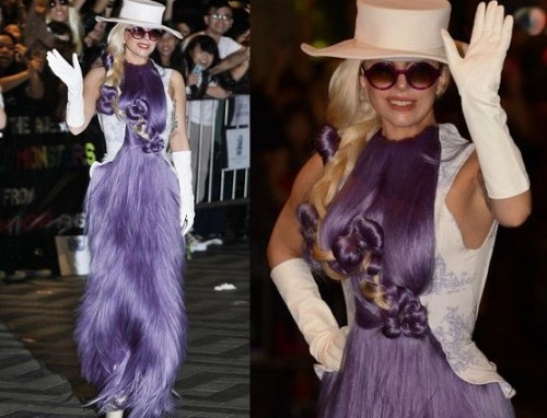 La cantante attualmente si trova ad Hong Kong per il suo tour “Born This Way Ball” e l’altro giorno è stata vista uscire dall’albergo Ritz con un abito Moschino della collezione a/i 2012 dalle linee molto chic. Pensiamo che abbia avuto paura di risultare troppo “normale” e sobria solo con questo abito nero con rifiniture bianche e bottoni in oro, decidendo così di abbinare delle scarpe con maxi plateau e tacco vertiginoso ed occhiali dalla montatura bianca e dalla forma tonda.