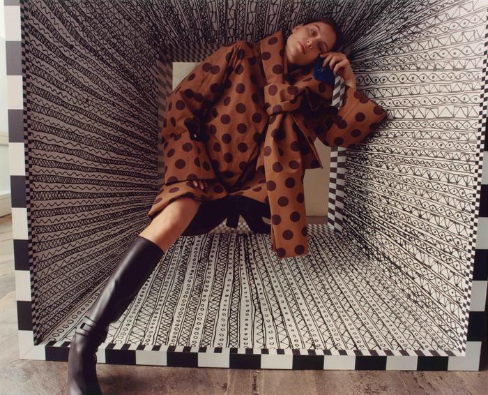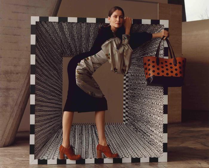 L’iconica modella, attrice e regista francese è stata ritratta da Jamie Hawkesworth all’interno di uno speciale set fotografico ideato da M/M (Paris). Una struttura quadrata che gioca con il grafismo di bianco e nero è stata installata all’interno della maison de l’Unesco di Parigi, dove la collezione ha sfilato a marzo. Un dialogo fisico con un oggetto angolare, che non arriva mai a contenere la forte femminilità di Laetitia Casta, personificazione di una moderna odalisca in undici look con lo styling di Benjamin Bruno.