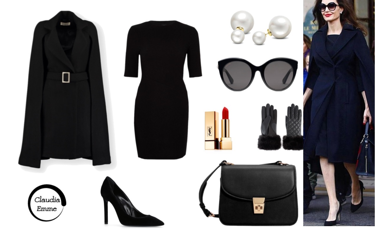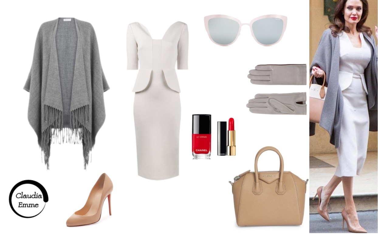 Il secondo look, ugualmente elegante, è davvero glamour. Parti da un tubino bianco aderente lungo fino al ginocchio (quello di Angelina è il Comberton di Roland Mouret) e aggiungi semplicemente una cappa grigia dallo stile casual (quella scelta per te è di Warehouse e costa solo 18 dollari!) , meglio se in cashmere o lana per resistere al freddo di questi giorni. Aggiungi una scarpa con tacco color nude o neutro, una borsa beige e guantini grigi. Completa il look con smalto e rossetto rosso e occhiali maxi (TopShop).