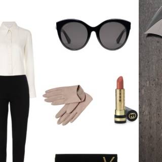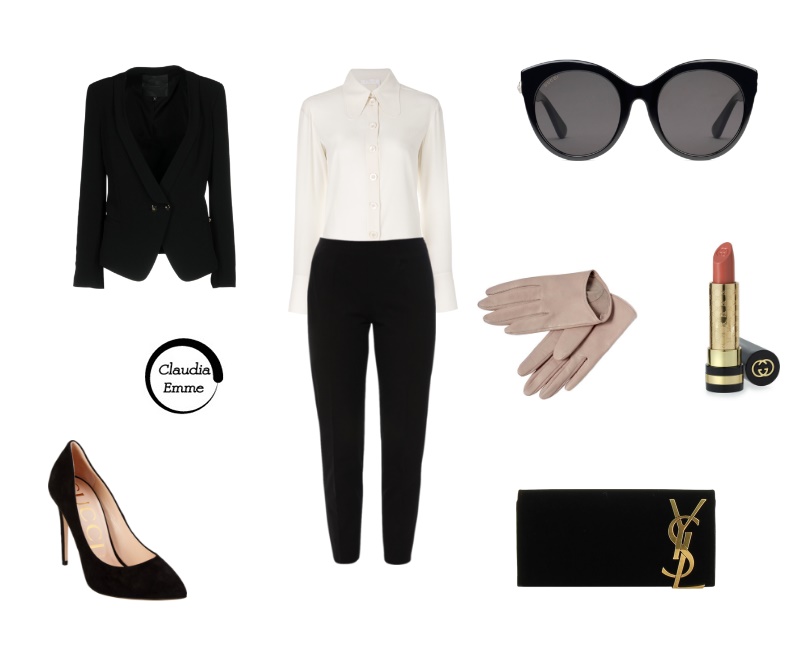 Parti da una classica camicia bianca, puoi sceglierla semplice come quella di Chloé scelta da noi o con ruches o fiocco sul collo, come va di moda adesso. Aggiungi un classico senza tempo: giacca e pantaloni neri. Abbiamo selezionato per te dei pantaloni stile Audrey di Piazza Sempione, corti alla caviglia, proprio come quelli sfoggiati da Meghan Markle (i suoi fanno parte di un completo Alexander McQueen), e giacca Philipp Plein. A questo punto il gioco è fatto! Abbina un paio di scarpe nere in suede con tacco e clutch nera (se vai a lavoro e hai bisogno di spazio anche una classica borsa nera a spalla è perfetta!). Aggiungi un paio di guantini neutri e un rossetto rosa chiaro, maxi occhiali da sole e il look easy chic alla Meghan è pronto!