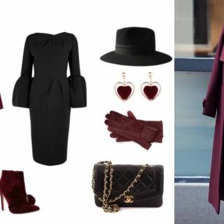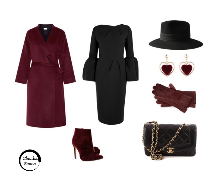 Il look di oggi è estremamente semplice ma al tempo stesso molto fashion. Inizia partendo da un semplicissimo tubino nero, che sicuramente avrai nell’armadio. Quello scelto da noi ha le maniche lunghe a sbuffo ed è firmato ROKSANDA ma qualsiasi altro tipo di tubino nero è adatto per l’outfit del giorno. Una volta indossato il black dress giusto il gioco è fatto! Abbina un caldo cappotto color burgundy. Perfetto il modello a vestaglia con cintura in vita, vero must have di stagione, come quello di PAUL & JOE scelto da noi. Aggiungi un tronchetto velvet burgundy, come quello super chic di Ted Baker London adesso in saldo ad 83 sterline. Borsa Chanel vintage, guantini burgundy in suade, cappello in stile retrò modello Audrey e orecchini burgundy, il gioco è fatto! Siete pronte per una nuova giornata di lavoro super glamour!