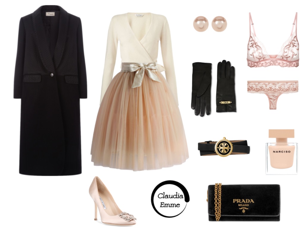 Ti senti bambolina? Scegli la gonna in tulle dai toni neutri. Per rendere il look super sexy abbina dettagli neri e le romantiche scarpe con tacco di Manolo. Lingerie? Rosa chiaro, come quella di La Perla.
