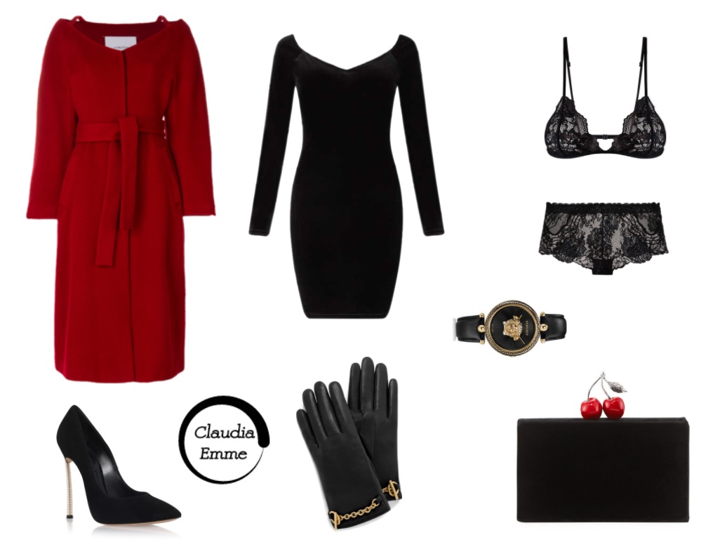Se ti senti sensuale, opta per un tubino nero aderente. Aggiungi un cappotto rosso e dettagli neri di lusso. Lingerie di pizzo nera, come quella selezionata da me, per un effetto sexy. Reggiseno Mosmann Australia Women's NYC Triangle Lace Bralette, €32 su LORDANDTAYLOR.COM e slip La Perla.