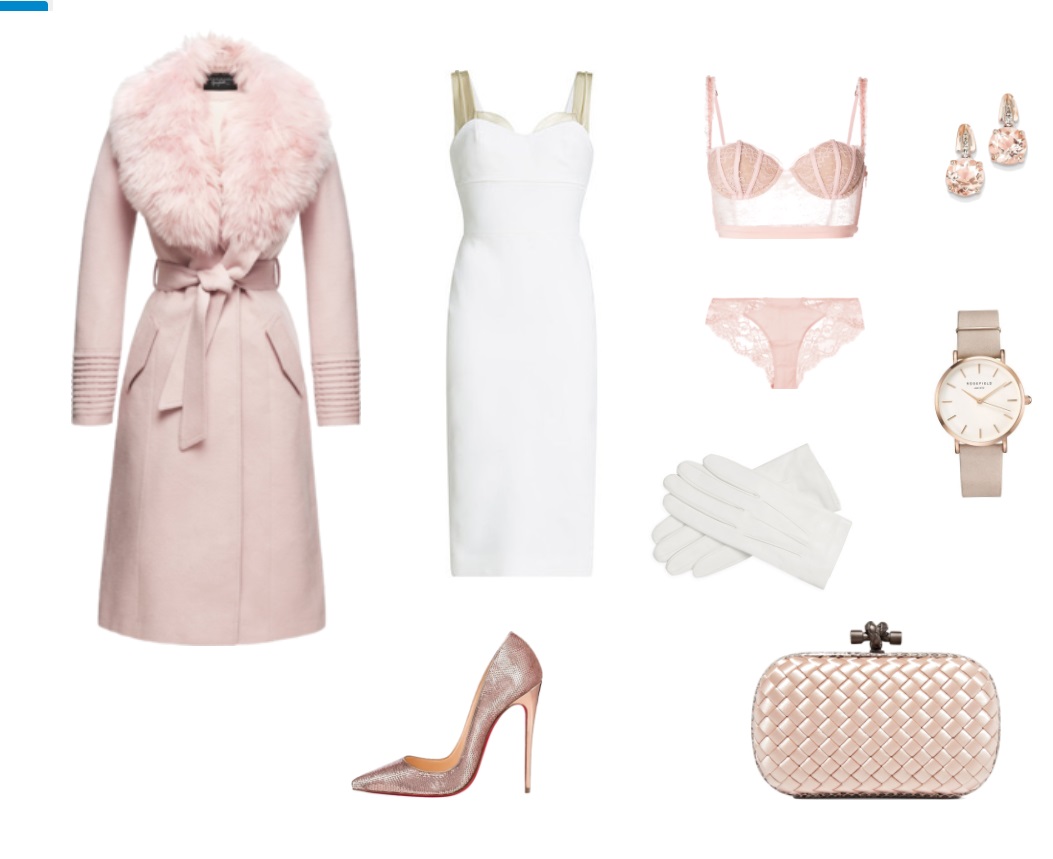 Se ti senti romantica scegli colori soft. Tubino bianco con dettagli gold, cappotto avvolgente e accessori rosa tenue ti conferiranno un look sensuale ma incredibilmente romantico. Intimo, ovviamente, effetto blush. Reggiseno e slip bianchi e rosa in pizzo, entrambi La Perla.