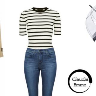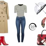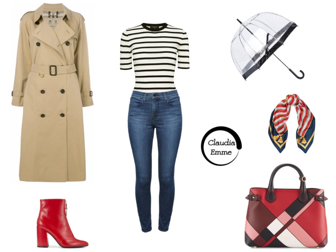 A questo punto il gioco è fatto: quando piove non si ha molta voglia di vestirsi ma non vi preoccupate! Tirate fuori dall’armadio il vostro jeans preferito, quello con cui vi sentite più a vostro agio. Basterà abbinarlo ad una t-shirt a righe bianca e nera (ma anche bianca e blu per un effetto navy chic) una borsa suo toni del rosso (perfetta quella Burberry) un foulard elegante (Ralph Lauren, 100 euro) e, ovviamente, prima di uscire ricordatevi di prendere il vostro ombrello più glamour! L’ombrello infatti non deve rappresentare solo un oggetto che ci ripara dalla pioggia ma dobbiamo renderlo un accessorio fashion che completa il nostro look! Perfetto quello trasparente di Fulton, a soli 23 euro!