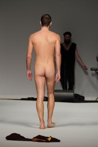 Sicuramente ottengono lo scopo di attirare l’attenzione sulla loro sfilata i due stilisti Pierfrancesco Gigliotti e Maurizio Modica, anche se tutti non parleranno degli abiti della loro collezione “Frankie Morello” per l’autunno/inverno 2012/13, ma del coup de theatre di chiudere con un uomo completamente nudo, l’attore Giuseppe Sartori della compagnia d’avanguardia Ricci/Forte.