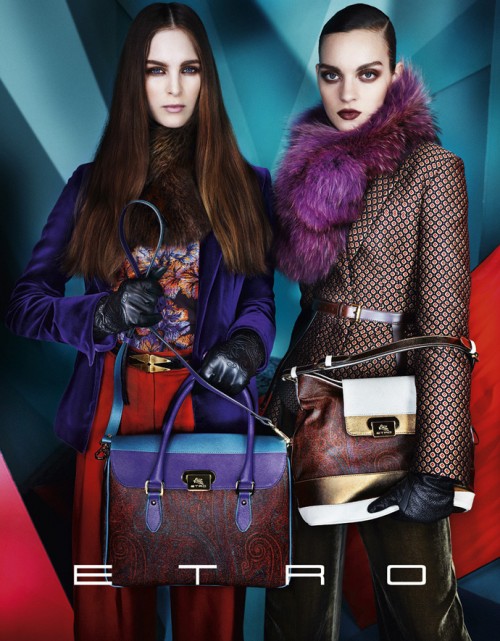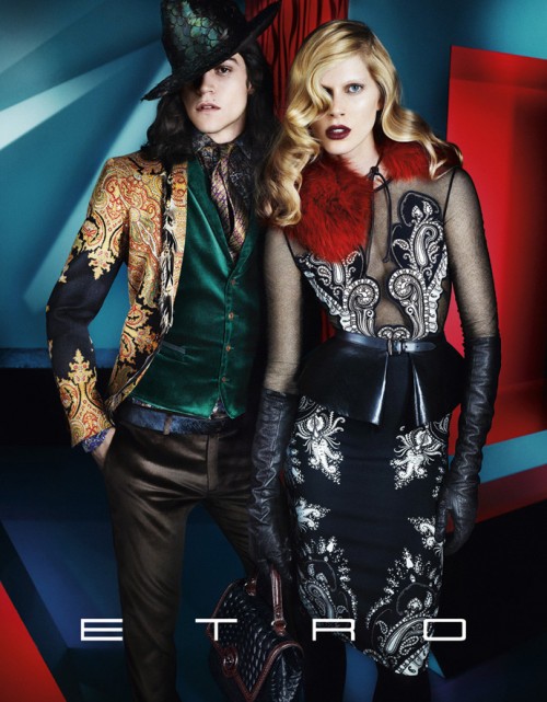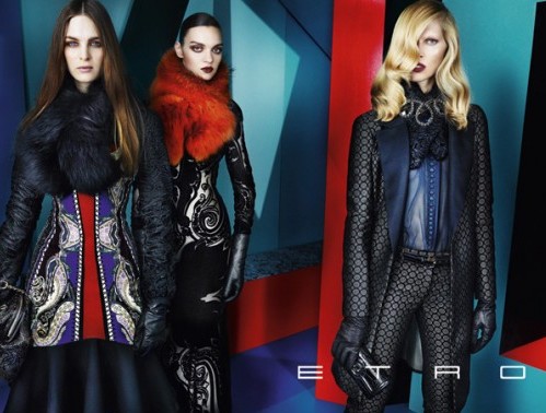 MILANO – Su Internet è stata rivelata la nuova campagna pubblicitaria di Etro, fotografata magistralmente da Mario Testino. Le immagini infatti mettono in particolare risalto la ricchezza degli abiti e la vivacità dei colori e delle stampe, l’accuratezza dei trucchi e delle acconciature. Veronica Etro per la sua collezione è partita dalla stampa paisley patrimonio familiare per arrivare a disegnare una donna dandy mitteleuropea che diventa particolarmente seducente quando alle stampe si abbinano marsine di pelle nera, top di rete o giacche di velluto.