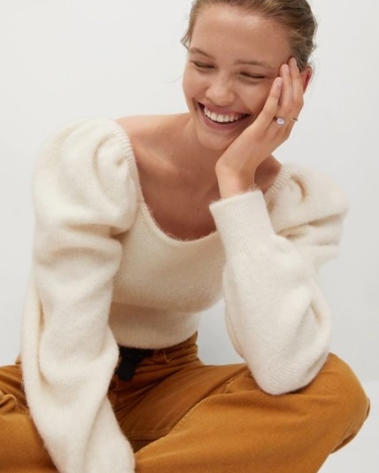 Parliamo di un pullover bianco con maniche a palloncino firmato Mango, in vendita al prezzo di 39,99 euro.