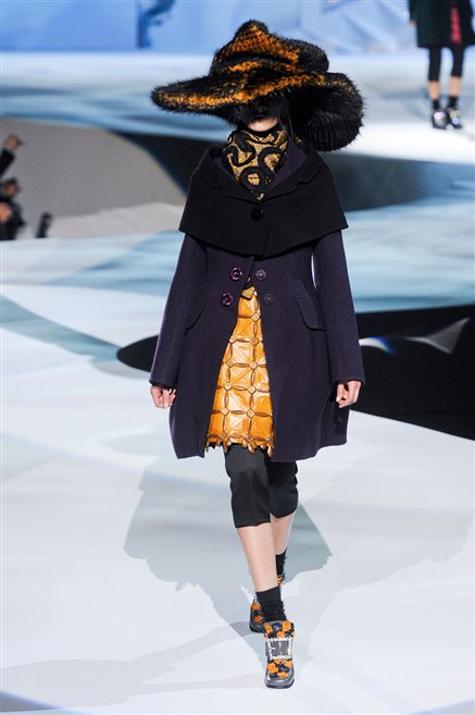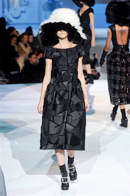 Ed ecco in passerella forme inaspettate su uno styling studiato alla lettera: una parata di cappotti tappezzeria e mantelle di lana, scarpe con tacco e mocassini maschili, gonne a metà gamba e gonne corte a corolla, abiti e gonne a clessidra e bustier di pelle allungati sui fianchi, raso croccante e cuoio duro. Parola d’ordine è accostamenti azzardati ma vincenti e sovrapposizioni creative.
