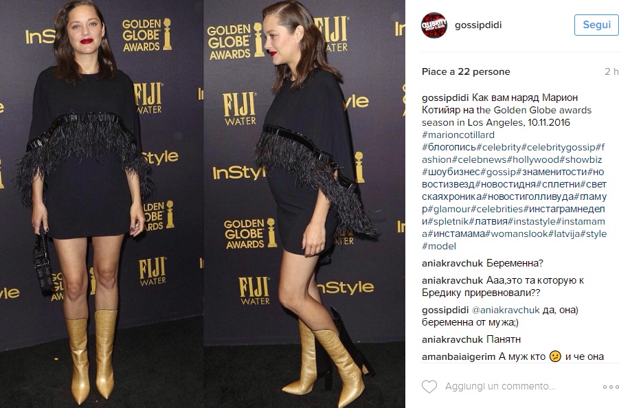 Nonostante gli ultimi gossip che l’hanno vista coinvolta nel divorzio tra Angelina Jolie e Brad Pitt, Marion Cotillard sta vivendo un momento d’oro sia per quanto riguarda la carriera che la vita privata. In questi giorni è in uscita il film “Allied” in cui ha recitato al fianco proprio di Brad Pitt con cui, secondo i gossip, avrebbe avuto un flirt proprio durante le riprese. Rumors becero smentito duramente da Marion, che in questo momento è anche in dolce attesa. L’attrice aspetta un figlio da Guillaume Canet, il secondo dopo Marcel, nato nel 2011. Quando sono uscite le voci di un suo presunto flirt con Brad Pitt, Marion ha messo a tacere la notizia tramite un post molto duro sul suo profilo Instagram: