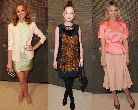 L’attrice di “Glee” Jayma Mays: ha scelto un look luminoso e fresco che non fa parte della collaborazione tra Marni ed H&M, sulla tonalità menta con una blusa con colletto infilata in una gonna dalla trama in oro. Un blazer panna completa il look. Per quanto riguarda gli accessori ha scelto una clutch Accessorize e delle pump color nude nude.