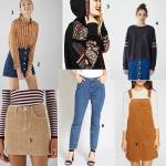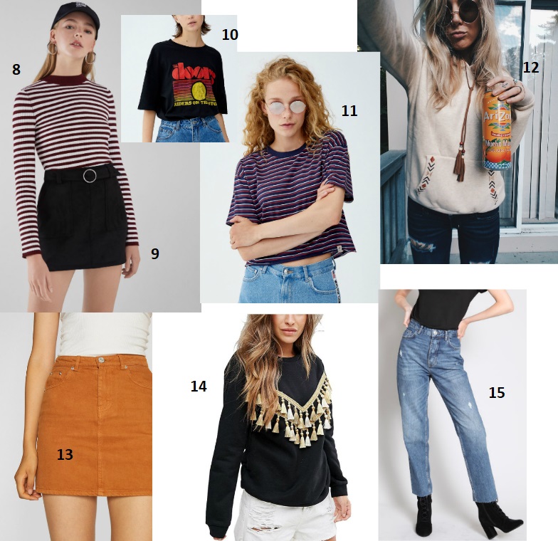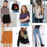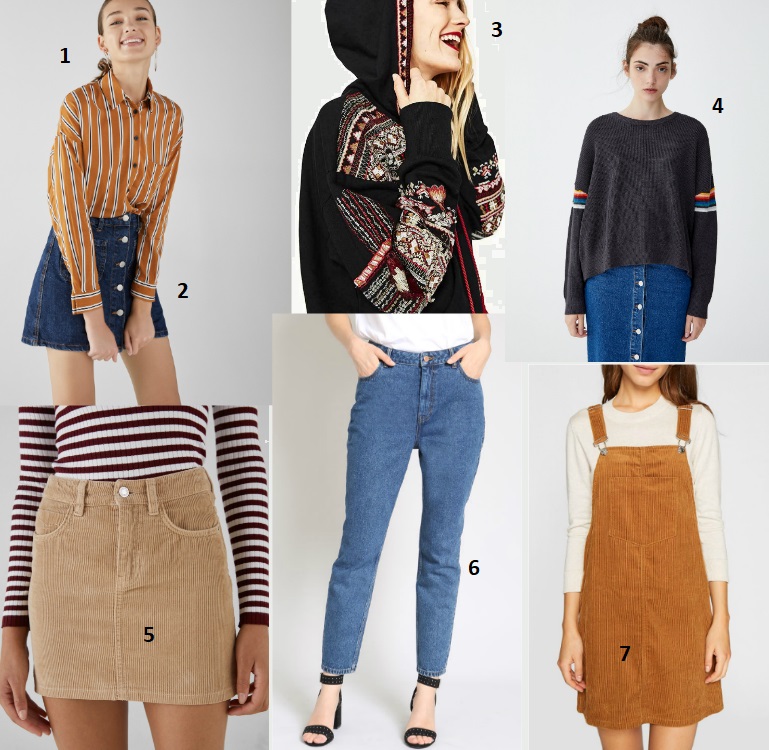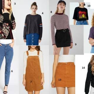 1) Camicia a righe color giallo ocra, Bershka, 15,99 € , 2) Gonna jeans con bottoni, Bershka, 17,99 € , 3) maglione Bohoo ricamato, namastay-wild.com, € 30 , 4) maglione maniche arcobaleno, Pull&Bear, €25,99, 5) gonna in velluto a costine, Bershka, €15,99 , 6) Mom Jeans blu scuro effetto vintage, Pimkie, €25,99 , 7) Overall a costine color cammello, Stradivarius, €19.99 , 8) maglia a righe a costine, Bershka, €12,99 , 9) minigonna a vita alta con cintura in vita, Bershka, €17,99 , 10) t-shirt stampata The Door, Pull&Bear, €15,99 , 11) T-shirt a righe multicolore effetto vintage, Pull&Bear, €9,99 , 12) Maglia etno bohoo, namastay-wild.com, €30 , 13) gonna denim color cammello, Stradivarius, €19,99 , 14) felpa con nappine bohoo, namastay-wild.com, €30 , 15) jeans dritto a vita alta effetto vintage, Pimkie, €29,99