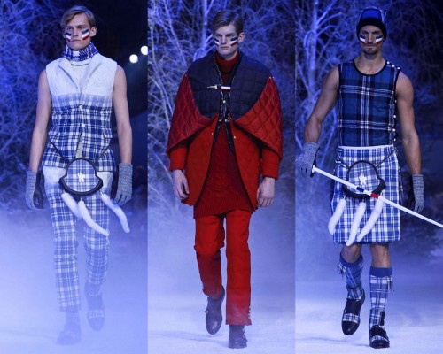 Thom Browne disegna una collezione con i colori della neve e del ghiaccio, in cui regnano tutte le sfumature del blu e spiccano i tipici giochi delle Highland scozzesi, come le giacche in tartan con dettagli plissé, la gonnella e i pantaloni con l’imbottitura in piumino.