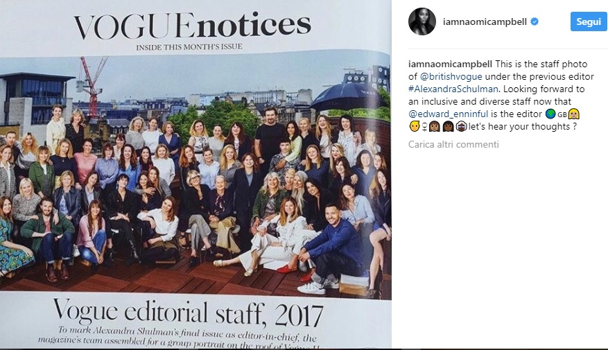 LONDRA – Naomi Campbell bacchetta l’ex direttrice di Vogue UK, Alexandra Shulman. Il motivo? Perché quando era a capo della rivista di moda più famosa del pianeta avevano uno staff un po’ troppo omogeneo dal punto di vista etnico. La top model ha pubblicato su Instagram una foto in cui si vedono i collaboratori della rivista sotto la direzione Shulman. “Puntiamo a un più inclusivo e diversificato staff ora che Edward Enninful è l’editore?”, scrive Naomi. Enninful è di origine africana e l’invito della modella è quello di portarlo a scegliere per il suo entourage anche persone di colore. Sappiamo quanto Campbell abbia fatto per rendere la moda più inclusiva nei termini che intende lei e non è escluso che Enninful prenda sul serio le parole della musa di Gianni Versace.