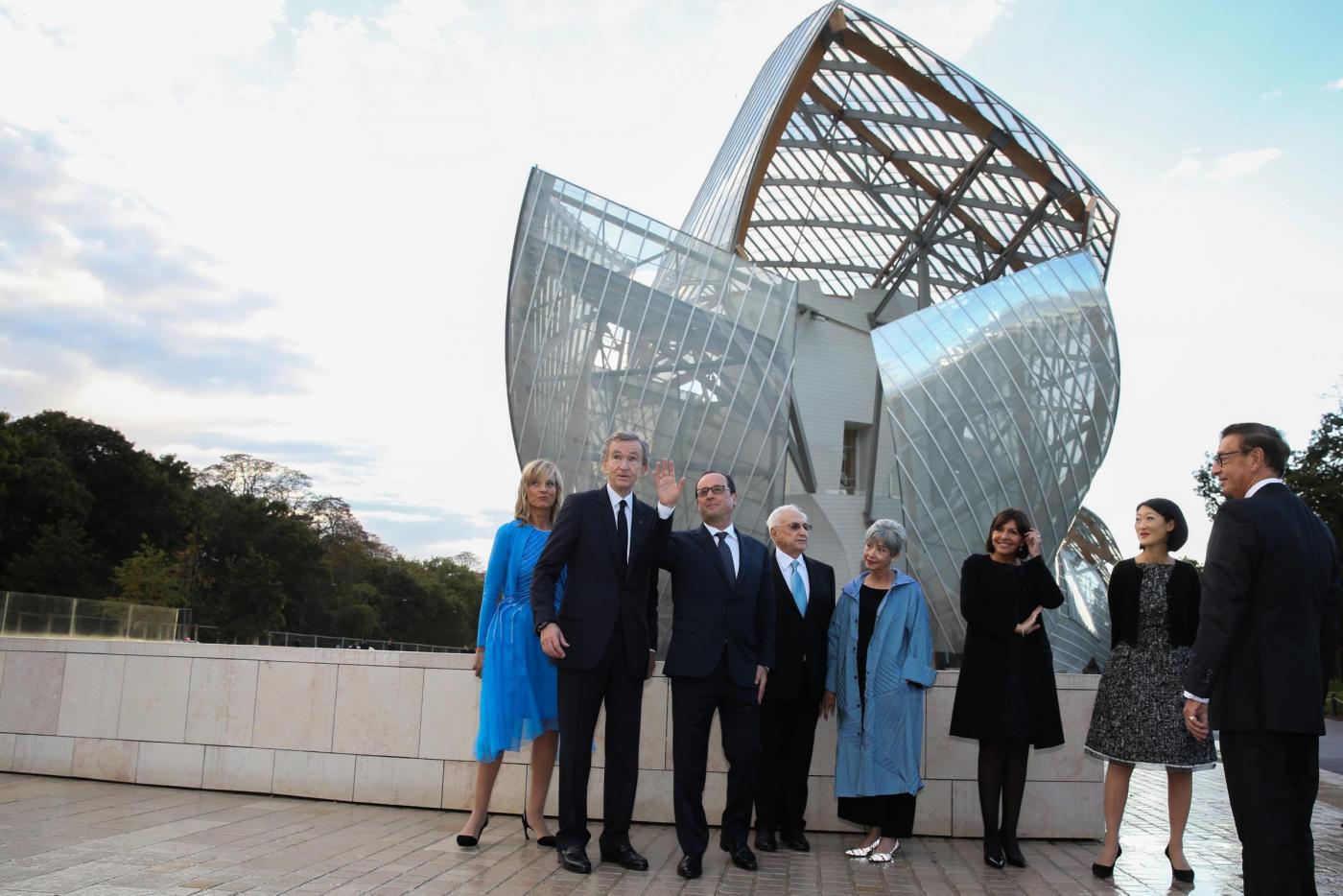 Fondazione Louis Vuitton (Foto La Presse)Frank Gehry, architecte du batiment de la fondation Louis Vuitton, Bernard Arnault, PDG du groupe LVMH, et leurs epouses, Francois Hollande, president de la Republique, Anne Hidalgo, maire de Paris, Fleur Pellerin, ministre de la cultureOfficial Opening Louis Vuitton Foundation. Paris, FRANCE-20/10/2014.PHOTO HAMILTON / POOL / MAXPPPTPČVMH CEO Bernard Arnault inaugruated his own private museum in Paris by French president Fran篩s Hollande on Monday.MaxPPP/LaPresseOnly Italy