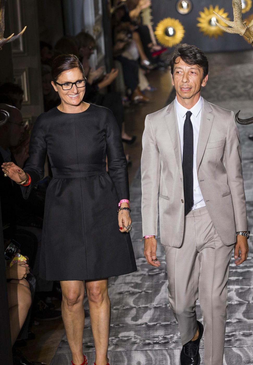 Fashion designers Maria Grazia Chiuri, left, and Pier Paolo Piccioli acknowledge applause following the presentation of the Haute Couture Fall-Winter 2013-2014 collection they designed for Valentino, Wednesday, July 3, 2013 in Paris. (AP Photo/Jacques Brinon)
