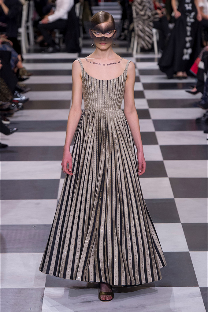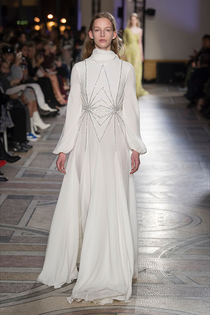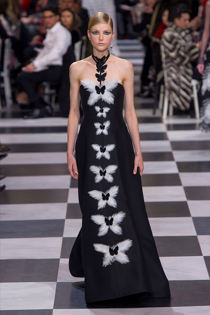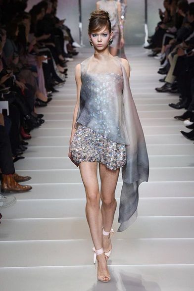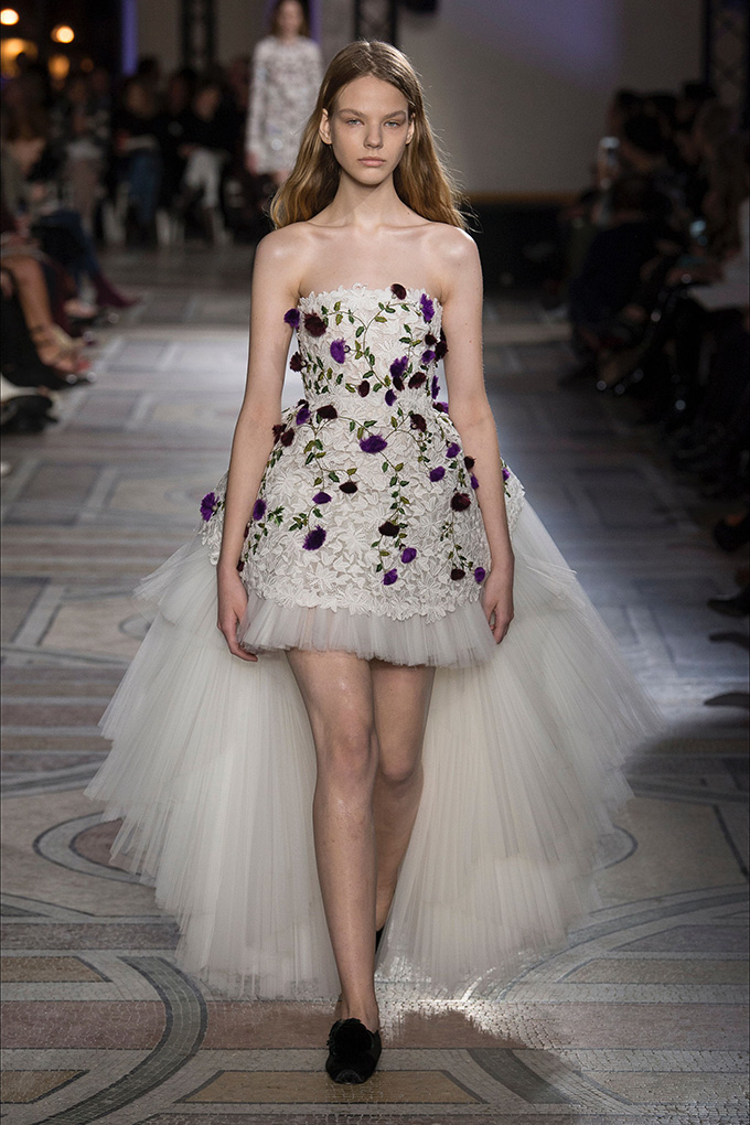 Scostumista-PARIS HAUTE COUTURE P/E 2018-Da un po’ di giorni sul profilo Instagram di Chanel è stato pubblicato un video/ teaser in cui sono inquadrate abili mani di esperti ricamatori e sarti intenti a preparare gli abiti per la collezione Alta Moda Primavera Estate 2018. La visione di quel video mi ha procurato una sensazione simile a quella che probabilmente prova un goloso mentre vede un grande maestro pasticcere che prepara torte squisite. L’attesa si stringe. Il gran giorno arriva: il 23 gennaio ore 10.00, al Grand Palais, in un’atmosfera che ricorda i giardini di Versailles, le modelle sfilano indossando la collezione più prestigiosa. Dai completi in tweed, segno distintivo della Maison, ai preziosissimi abiti ricamati con fiori trasparenti, piume e cristalli, balze di tulle e chiffon dai colori pastello; le modelle appaiono come parte di una natura leggiadra, l’aria fresca e il profumo di primavera sembrano essere dettagli intrinsechi negli abiti. Gli stivaletti ricamati con tacco-midi in plexiglass completano i look. La sfilata termina con l’ormai noto Hudson, il figlioccio del designer, che sparge rose da un cestino lungo il percorso della modella in abito da sposa. Se Marie Antoinette fosse vissuta oggi, la immagino vestita così. “È uno stato d’animo romantico, non solo basato sulle balze”- ha detto Karl Lagerfeld- “È una storia d’amore moderna. Non ho mai pensato di voler fare una collezione romantica – ma è finita così. ” Maria Grazia Chiuri aveva ben chiaro da dove far partire la collezione Dior. La designer ha la sua illuminazione dopo aver visitato l’epica mostra “Dior Couturier du rêve” al Musée des Arts Décoratifs, una delle prime stanze dell’esposizione conteneva pezzi della collezione d’arte che Mounsier Christian Dior aveva appassionatamente accumulato. La Chiuri scopre che Dior aveva amicizie come Dalì, Giacometti, Cocteau, Elsa Schiaparelli e Leonor Fini. Per la collezione Alta Moda Primavera Estate 2018 si ispira quindi al Surrealismo; e come gli artisti che appartenevano a quella corrente, anche Maria Grazia Chiuri sperimenta con giochi d’illusione ottica che solo un paziente lavoro a mano tipico dell’Haute Couture è capace di realizzare. Su un ampio pavimento a scacchi bianco e nero ricostruito nel grande tendone installato sul giardino del Musée Rodin, i modelli che sfilano richiamano prevalentemente i colori della scacchiera, mentre i corsetti intrecciati sul torace rievocano le grandi gabbie che pendono dal soffitto insieme ad altre sculture come occhi, nasi, orecchie.. chiari riferimenti alle opere di Dalì. Inoltre le maschere create dal cappellaio Stephen Jones infondono un fascino teatrale e misterioso agli abiti impeccabili e rigorosi. “C’è una grande differenza tra la couture italiana e quella francese”- ha detto la Chiuri- “La couture italiana è legata al lato sartoriale, (che significa indossabile) mentre la couture francese è più teatrale. Voglio un mix dei due.” Se Mariagrazia Chiuri dedica la collezione al movimento culturale nato a Parigi nei primi anni ’20 del Novecento, il Surrealismo è nel DNA del marchio Schiaparelli, e Bertrand Guyon sviluppa la collezione su simboli e miti pagani: scarabei, farfalle, cuori e serpenti si posano sui tessuti o semplicemente lunghi abiti trasparenti, pepli e mantelle trasformano la donna in una dea greca. Dee greche o romane con tuniche e pepli impreziositi da ricami e cristalli sfilano anche sulla passerella di Giambattista Valli; sono Veneri delicate o Minerve guerriere, e ciò che caratterizza questo Olimpo terreno è che tutte le creature che lo abitano indossano abiti semplicemente bellissimi. L’affermazione della designer di Dior per cui la couture italiana è più attenta alla perfetta portabilità di un vestito piuttosto che alla teatralità degli stessi, trova conferma nella collezione Armani Privé in cui sfilano mini-dress e short realizzati con tessuti delicati come l’organza e la seta, leggeri e impalpabili come nuvole, i colori sono quelli di Antigua, isola cara allo stilista, il taglio impeccabile e senza eccessi rende questi abiti assolutamente adatti a molteplici occasioni, in una parola”portabilissimi”. In questi primi due giorni di sfilate, l’attenzione va anche e soprattutto alla designer olandese Iris van Herpen, che continua con le sue riuscitissime sperimentazioni in 3D, progettando una collezione ispirata alla natura, in cui i tessuti si dispiegano come ali o petali su trasparenze che fanno da sfondo discreto ad un paesaggio che sboccia rigoglioso. Si fa sera, l’ora è giusta per far iniziare la sfilata della griffe più dark e poetica: Givenchy, e con il debutto di Clare Waight Keller, la poesia da romantica diventa ermetica, l’assoluta ricerca di essenzialità si esplicita nella purezza delle forme, materiali preziosi come cristalli e organza si accostano al latex, la notte si chiude con l’acclamazione della nuova direttrice creativa, prima donna ad assumere il ruolo di direttore artistico della Maison Givenchy. di Annapaola Brancia d’Apricena