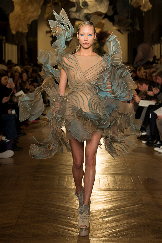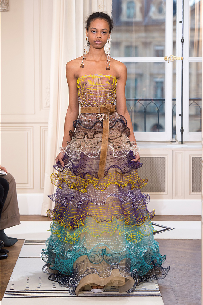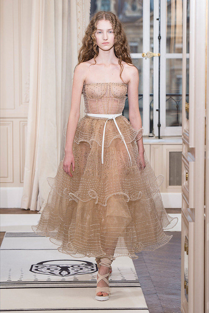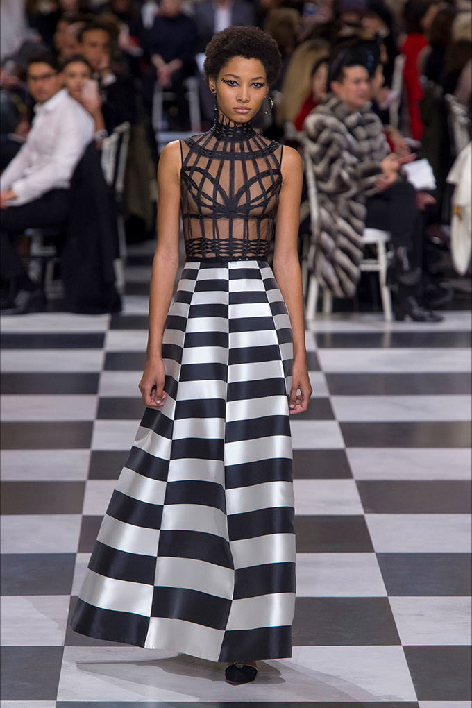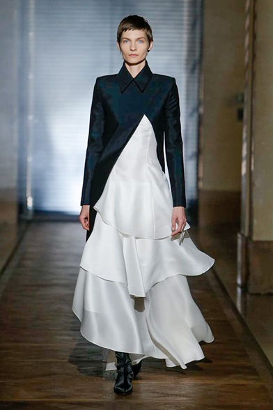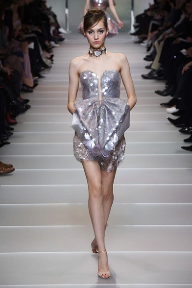 Scostumista-PARIS HAUTE COUTURE P/E 2018-Da un po’ di giorni sul profilo Instagram di Chanel è stato pubblicato un video/ teaser in cui sono inquadrate abili mani di esperti ricamatori e sarti intenti a preparare gli abiti per la collezione Alta Moda Primavera Estate 2018. La visione di quel video mi ha procurato una sensazione simile a quella che probabilmente prova un goloso mentre vede un grande maestro pasticcere che prepara torte squisite. L’attesa si stringe. Il gran giorno arriva: il 23 gennaio ore 10.00, al Grand Palais, in un’atmosfera che ricorda i giardini di Versailles, le modelle sfilano indossando la collezione più prestigiosa. Dai completi in tweed, segno distintivo della Maison, ai preziosissimi abiti ricamati con fiori trasparenti, piume e cristalli, balze di tulle e chiffon dai colori pastello; le modelle appaiono come parte di una natura leggiadra, l’aria fresca e il profumo di primavera sembrano essere dettagli intrinsechi negli abiti. Gli stivaletti ricamati con tacco-midi in plexiglass completano i look. La sfilata termina con l’ormai noto Hudson, il figlioccio del designer, che sparge rose da un cestino lungo il percorso della modella in abito da sposa. Se Marie Antoinette fosse vissuta oggi, la immagino vestita così. “È uno stato d’animo romantico, non solo basato sulle balze”- ha detto Karl Lagerfeld- “È una storia d’amore moderna. Non ho mai pensato di voler fare una collezione romantica – ma è finita così. ” Maria Grazia Chiuri aveva ben chiaro da dove far partire la collezione Dior. La designer ha la sua illuminazione dopo aver visitato l’epica mostra “Dior Couturier du rêve” al Musée des Arts Décoratifs, una delle prime stanze dell’esposizione conteneva pezzi della collezione d’arte che Mounsier Christian Dior aveva appassionatamente accumulato. La Chiuri scopre che Dior aveva amicizie come Dalì, Giacometti, Cocteau, Elsa Schiaparelli e Leonor Fini. Per la collezione Alta Moda Primavera Estate 2018 si ispira quindi al Surrealismo; e come gli artisti che appartenevano a quella corrente, anche Maria Grazia Chiuri sperimenta con giochi d’illusione ottica che solo un paziente lavoro a mano tipico dell’Haute Couture è capace di realizzare. Su un ampio pavimento a scacchi bianco e nero ricostruito nel grande tendone installato sul giardino del Musée Rodin, i modelli che sfilano richiamano prevalentemente i colori della scacchiera, mentre i corsetti intrecciati sul torace rievocano le grandi gabbie che pendono dal soffitto insieme ad altre sculture come occhi, nasi, orecchie.. chiari riferimenti alle opere di Dalì. Inoltre le maschere create dal cappellaio Stephen Jones infondono un fascino teatrale e misterioso agli abiti impeccabili e rigorosi. “C’è una grande differenza tra la couture italiana e quella francese”- ha detto la Chiuri- “La couture italiana è legata al lato sartoriale, (che significa indossabile) mentre la couture francese è più teatrale. Voglio un mix dei due.” Se Mariagrazia Chiuri dedica la collezione al movimento culturale nato a Parigi nei primi anni ’20 del Novecento, il Surrealismo è nel DNA del marchio Schiaparelli, e Bertrand Guyon sviluppa la collezione su simboli e miti pagani: scarabei, farfalle, cuori e serpenti si posano sui tessuti o semplicemente lunghi abiti trasparenti, pepli e mantelle trasformano la donna in una dea greca. Dee greche o romane con tuniche e pepli impreziositi da ricami e cristalli sfilano anche sulla passerella di Giambattista Valli; sono Veneri delicate o Minerve guerriere, e ciò che caratterizza questo Olimpo terreno è che tutte le creature che lo abitano indossano abiti semplicemente bellissimi. L’affermazione della designer di Dior per cui la couture italiana è più attenta alla perfetta portabilità di un vestito piuttosto che alla teatralità degli stessi, trova conferma nella collezione Armani Privé in cui sfilano mini-dress e short realizzati con tessuti delicati come l’organza e la seta, leggeri e impalpabili come nuvole, i colori sono quelli di Antigua, isola cara allo stilista, il taglio impeccabile e senza eccessi rende questi abiti assolutamente adatti a molteplici occasioni, in una parola”portabilissimi”. In questi primi due giorni di sfilate, l’attenzione va anche e soprattutto alla designer olandese Iris van Herpen, che continua con le sue riuscitissime sperimentazioni in 3D, progettando una collezione ispirata alla natura, in cui i tessuti si dispiegano come ali o petali su trasparenze che fanno da sfondo discreto ad un paesaggio che sboccia rigoglioso. Si fa sera, l’ora è giusta per far iniziare la sfilata della griffe più dark e poetica: Givenchy, e con il debutto di Clare Waight Keller, la poesia da romantica diventa ermetica, l’assoluta ricerca di essenzialità si esplicita nella purezza delle forme, materiali preziosi come cristalli e organza si accostano al latex, la notte si chiude con l’acclamazione della nuova direttrice creativa, prima donna ad assumere il ruolo di direttore artistico della Maison Givenchy. di Annapaola Brancia d’Apricena