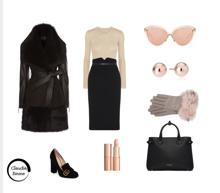 Pencil skirt nera a vita alta Karen Millen (145 euro), maglia aderente color crema e scarpe con tacco a mocassino Gucci. Completa il look con un caldissimo cappotto in alcantara e pelliccia (Karen Millen), tote bag Burberry, guantini con pelliccetta (Ted Baker, 130 euro su BLOOMINGDALES.COM) e occhiali Linda Farrow. Un tocco di rossetto color neutro rende l'outfit raffinato ed elegante.