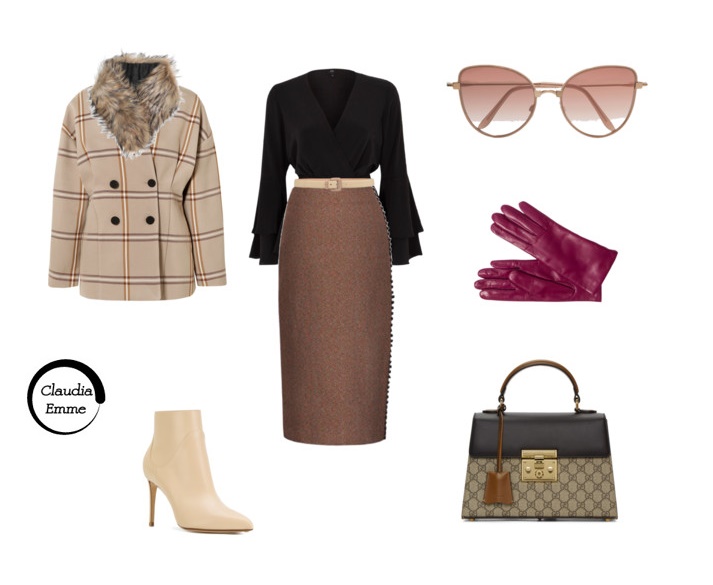 Super chic questa gonna a matita acquistabile su The Box Boutique a sole 115 sterline. Aggiungi una blusa nera come quella di River Island, ora a soli 48 euro sul sito ufficiale. Cintura crema (Etro, 71 euro su YooX) tronchetto crema e cappottino check, come quello di TOTÊME, 625 dollari su net a Porter. Aggiungi una fake fur, guantini fucsia (48 euro su ruelala). borsa Gucci e maxi occhiali da gatta.