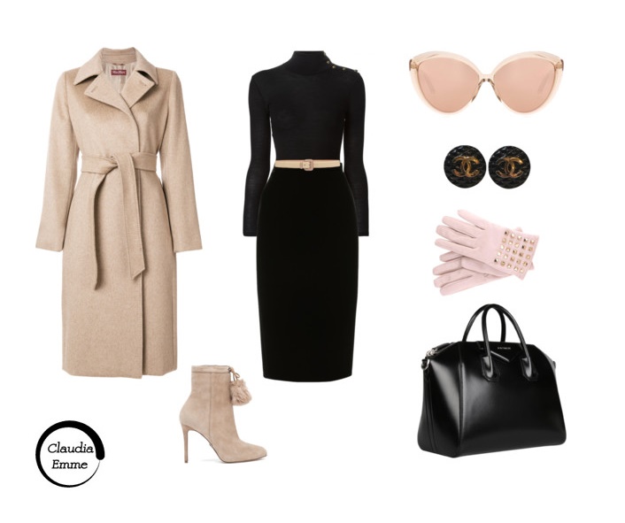 Total black per questo completo formato da pencil skirt aderente a vita alta firmata LK Bennett (180 euro), maglioncino a collo alto e cintura crema. Tronchetto crema i suade (MICHAEL, MICHAEL KORS) e borsa nera Givenchy. Completa il look con un cappotto caldo color crema, come quello di Max Mara scelto per voi, orecchini Chanel a bottoncino e occhiali da sole Linda Farrow.