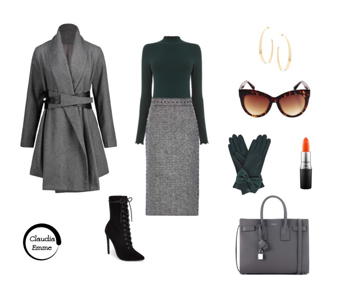 Se ami il grigio, scelgi una pencil skirt di questo colore, come quella di Valentina scelta da me. Abbina una maglia a collo alto color verde bosco. Avvolgiti in un caldo cappotto color grigio chiaro: bellissimo quello acquistabile su Rosegal a soli 33 dollari. Aggiungi una borsa grigia, guantini in suade verdi (Gizelle Renee, 79 euro) e occhiali da diva. Tronchetti neri con lacci Steve Madden e un tocco di rossetto arancio.