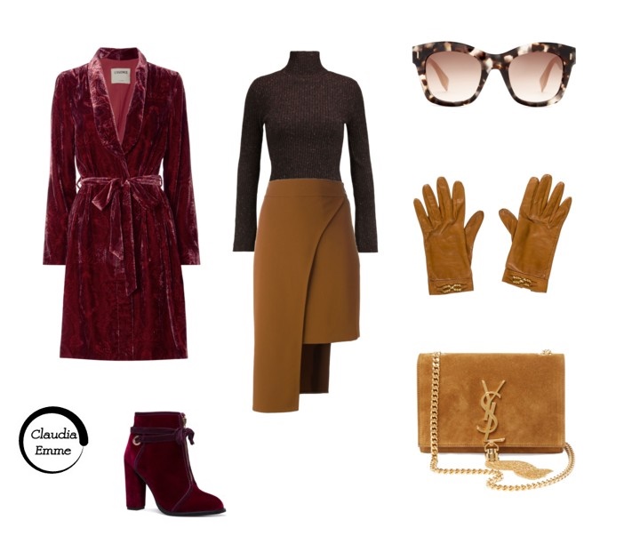 Colori caldi per questo completo chic e glamour: pencil skirt color senape firmata Cushnie Et Ochs, guanti e clutch abbinati, maglioncino a collo alto marrone scuro AUTUMN CASHMERE, cappotto velvet a vestaglia firmato L'AGENCE e tronchetto velvet burgundy, 49 sterline su shoedazzle.com. Occhiali tartarugato Fendi.