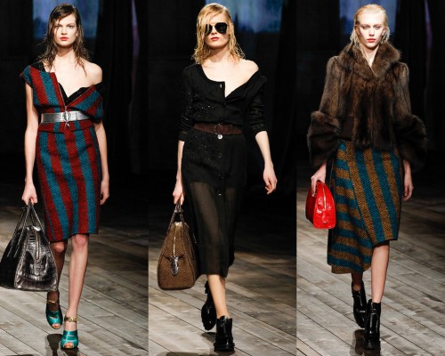 Una collezione in cui le proposte più femminili, a partire dagli abiti da sera abbassati sulle spalle, sono rese contemporanee dall’abbinamento con pezzi ‘duri’ come il giaccone di coccodrillo o i sandali con la para militare. Una necessità creativa, ma non solo. Miuccia Prada spiega: “Vuoi essere romantica ma non puoi, è una fantasia proibita. Questo rispecchia la vita d’oggi dove nulla d’esagerato è più consentito. Non puoi essere decadente, la modernità ti costringe a una restrizione intellettuale”.
