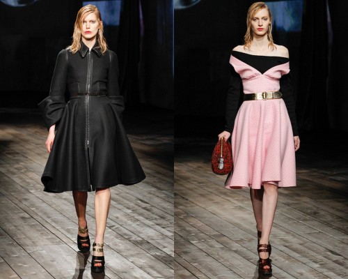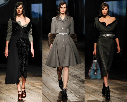 MILANO – Pochi pezzi, ma buoni. In tempo di “austerity” Prada pensa all’essenziale, pur non rinunciando all’eleganza. Così un vestito, una cintura, un cappotto importante creano uno stile chic e sostanziale. Una collezione dall’eleganza “cruda” quella di Prada, presentata in uno spazio sospeso tra proiezioni romantiche e un allestimento industriale a cura di AMO.