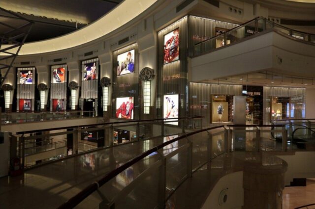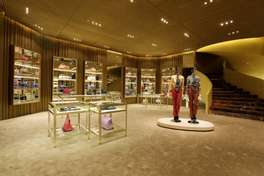retroilluminata, che si affaccia sul grande atrio del mall e raggiunge i 10 metri di altezza. Lo spazio interno è delineato da soffitti e pareti rivestiti in morbida tenda di damasco e pavimento in marmo marrone. Piccole “cassette di sicurezza” in metallo dorato accolgono le collezioni accessori, mentre l’abbigliamento è presentato nei nuovi mobili a cassaforte. Di grande impatto visivo la scala elicoidale – realizzata con gradini in marmo marrone e parapetto in damasco – che collega i due livelli e costituisce il fulcro dello spazio architettonico.