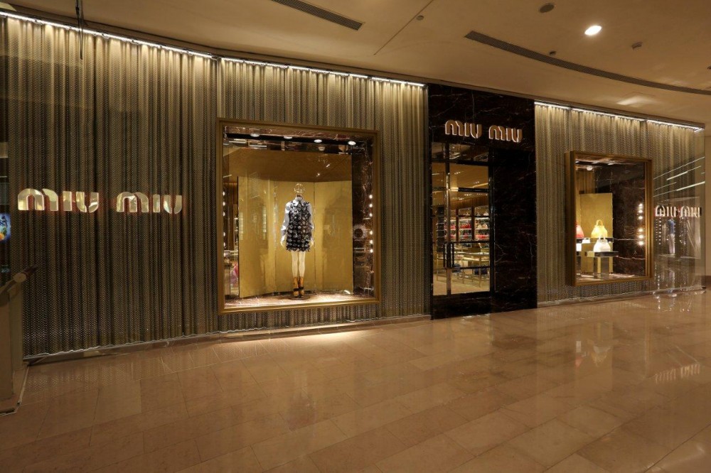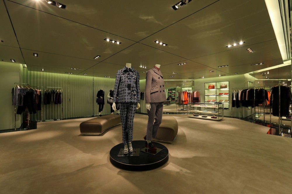 Il negozio Miu Miu, invece, è distribuito su due livelli per una superficie complessiva di circa 1.000 metri quadrati ed ospita le collezioni uomo e donna di abbigliamento, calzature, borse e accessori. Anche gli spazi di questa boutique sono sofisticati, in linea con lo stile del marchio. Gli ingressi, le vetrine e i light-box sono incorniciati dal marmo nero Marquina e da finiture in acciaio lucido.