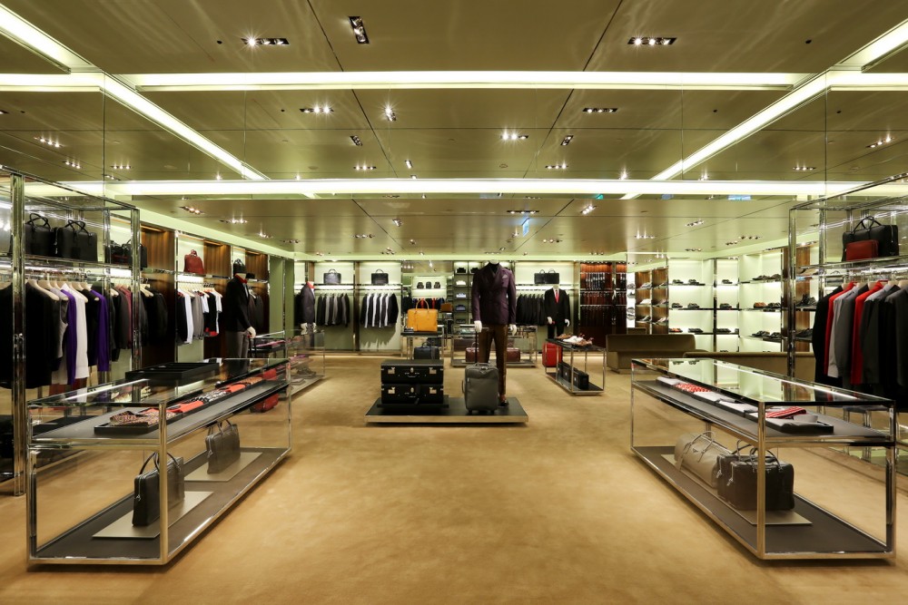 Nelle atmosfere sofisticate del negozio si distinguono i banchi creati in acciaio lucido, con dettagli in pelle saffiano chiaro, e le morbide sedute curve, rivestite in velluto castorino. L’ambiente maschile è invece caratterizzato dal legno di ebano per i mobili e dal saffiano colorato dai toni accesi per gli elementi del display.