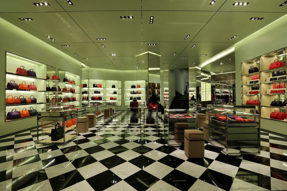 L’interno è concepito come un susseguirsi di spazi dalle differenti ambientazioni. Al livello inferiore si trova l’esposizione della pelletteria donna, oltre a un’ampia area destinata alle proposte maschili. Il piano superiore è invece dedicato all’universo femminile contraddistinto da pareti realizzate in tenda di tela verde e specchi.