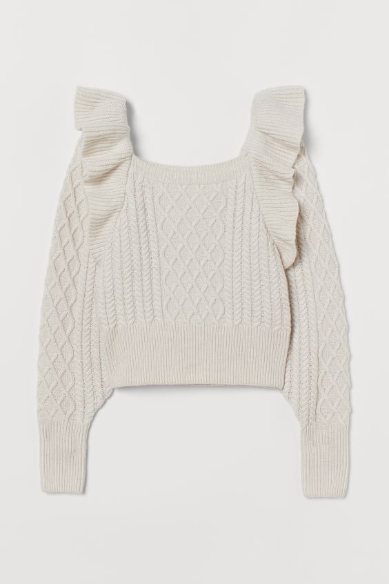 Scollo squadrato, ampio bordo a volant in maglia a coste sulle spalle. Maniche lunghe e ampie.
