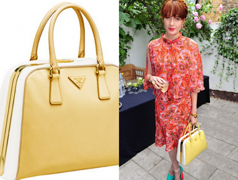 Florence Welch decide invece di abbinare la Pyramide gialla ad un abito arancione con stampe floreali, a dimostrazione che la borsa si adatta veramente con tutto,