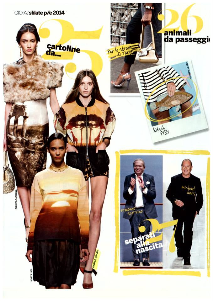 “D’estate, poi, è più facile avere audacia, così molte passerelle sono state rallegrate da una ventata di gioiosa follia. Il direttore creativo del brand MSGM, Massimo Giorgetti, ad esempio, non ha mai fatto mistero di amare le stampe. Questa volta la tumultuosa natura tropicale esce nel vero e proprio senso dalla parola dagli abiti grazie ad applicazioni tridimensionali, abbinate ai tagli lineari degli abiti, proprio per evitare un effetto eccessivo, che, invece, sembra predominante nella capsule che lo stilista ha realizzato con la rivista Toilet Paper e le sue immagini visionarie. Un’altra griffe che da sempre si distingue per le sue fantasie è Au Jour Le Jour, che conferma il proprio credo anche in questa bella stagione, con tanti mini abiti divisi in due parti, dove una sembrerebbe essere il negativo dell’altra. Anche i vestiti sopra il ginocchio di Angelo Marani hanno due anime. Paesaggi tropicali e stampe animalier in diverse tonalità si rincorrono tra gonna e corpetto con un effetto che aiuta a esaltare il fisico”