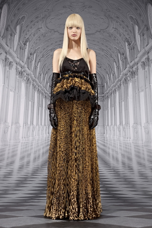 Una nuova georgette di seta per dare sostegno alla linea dei capi, una leggerissima gazare di seta per i volumi degli abiti, jacquard di lana con varie declinazioni di disegni animalier. Le pellicce sono realizzate con intarsi di pellami, ricami, vernice e pelle e grande uso del plissé, in tutte le sue declinazioni.