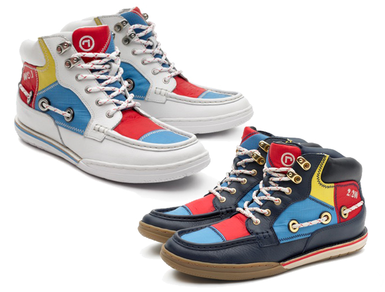 I designer hanno proposto un modello eco compatibile, utilizzando tessuto velico trovato nelle scuole di vela di Boston e realizzando la linguetta e la fodera interna in mesh con materiali riciclati al 50%.