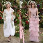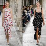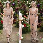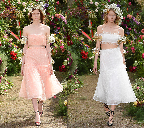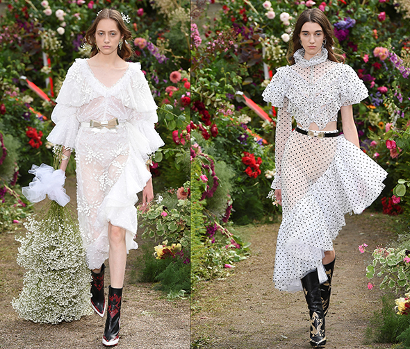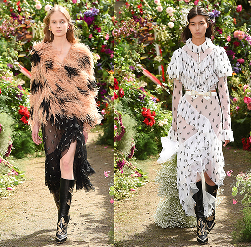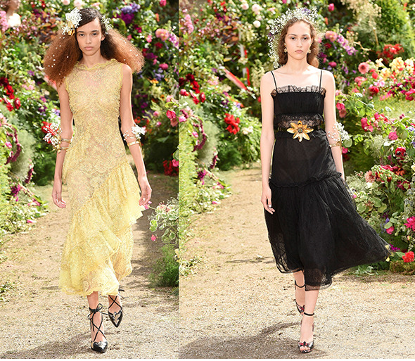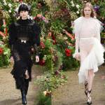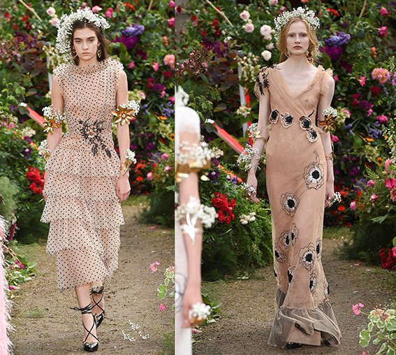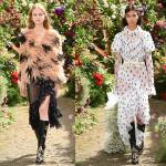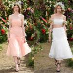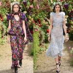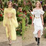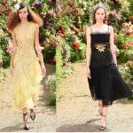 Passando al brand che ha base a Los Angeles, sempre il 2 Luglio, nell’antica abbazia di Port-Royal, in un giardino fiorito pieno di colori, 46 abiti meravigliosi e superfemminili ci riportano ad atmosfere campestri, i colori sono delicati o vividi, i tessuti impalpabili alternati alla pelle, balze, trasparenze, applicazioni unite da un fil-rouge rappresentato da una nocchetta rigida in metallo dorato in vita che accompagna la maggior parte degli outfit, il tutto stemperato da boots o scarpe con tacco. Questa collezione di Rodarte è semplicemente meravigliosa.