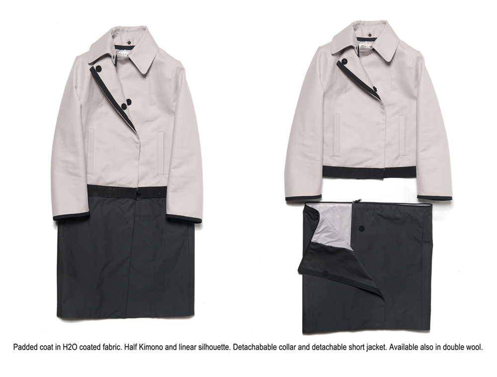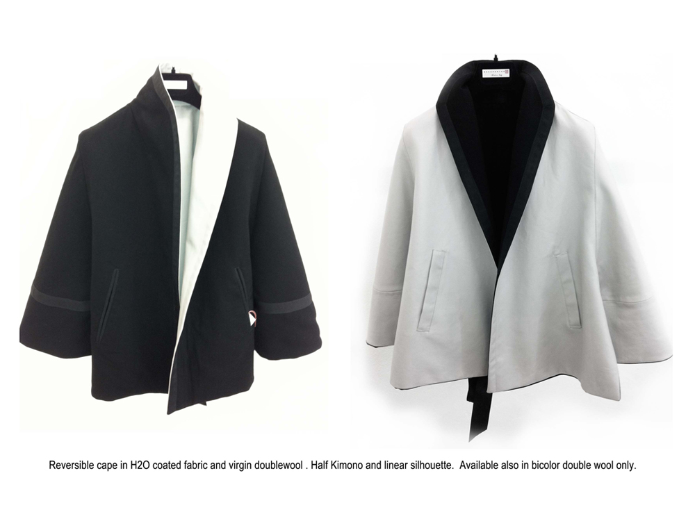 Ecco quindi i capi impermebili in 100% cotone, antipioggia e antivento, abbinati alla pura lana per cappe reversibili e waterproof realizzati da pezzi sovrapposti, i cappotti e le mantelle che giocano con il bicolor della lana double-face nella realizzazione del lungo Kimono staccabile in giacca con o senza collo, nella redingote composta da gilet lungo e giacchina e nella cappa iperfemminile reversibile.